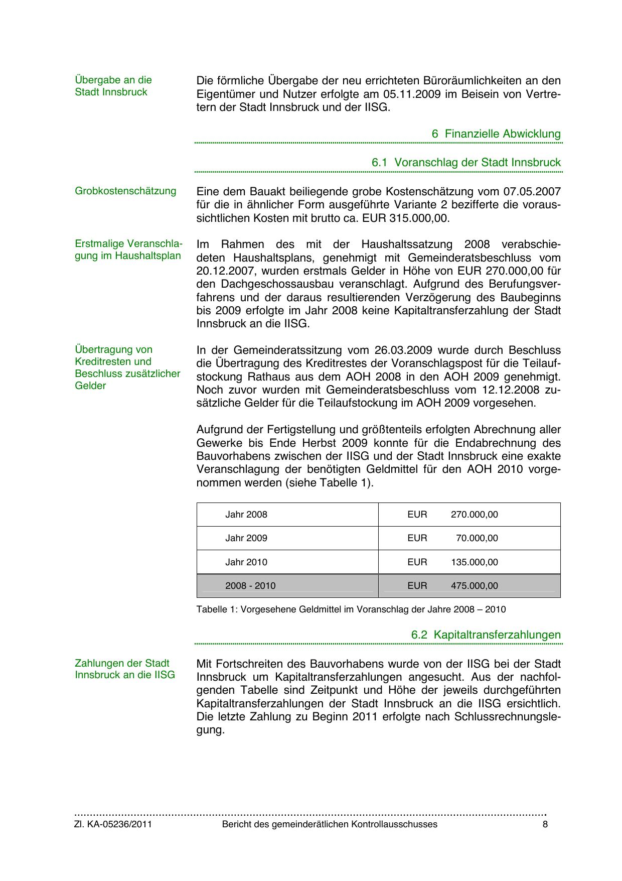 Innsbruck um Kapitaltransferzahlungen angesucht. Aus der nachfolgenden Tabelle sind Zeitpunkt und Höhe der jeweils durchgeführten