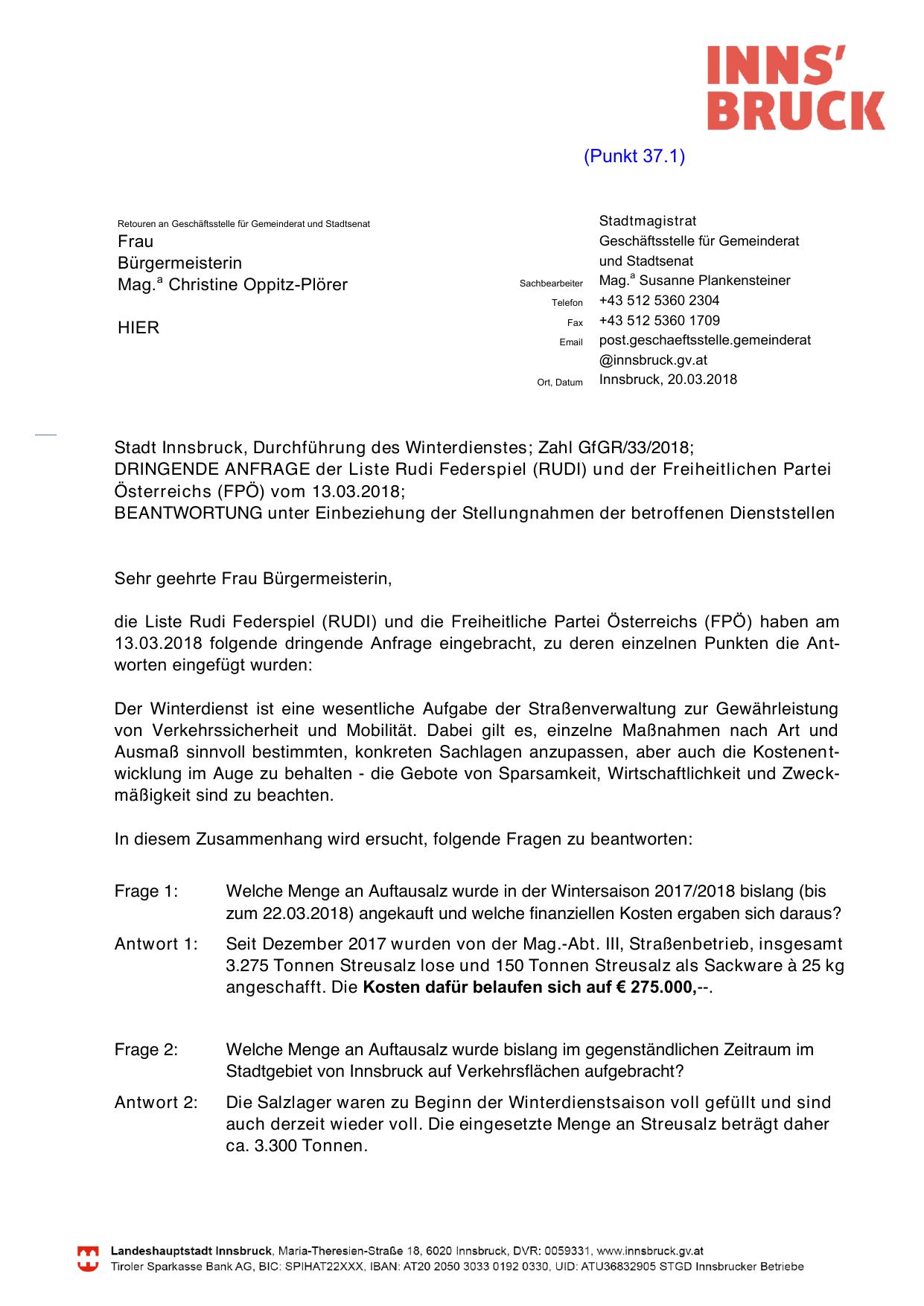 Stadt Innsbruck, Durchführung des Winterdienstes; Zahl GfGR/33/2018;