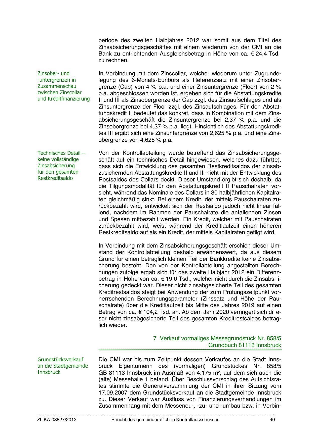Grund für einen betraglich kleinen Teil der Bankkredite keine Zinsabsicherung besteht. Den von der Kontrollabteilung angestellten Berechnungen zufolge ergab sich für das zweite Halbjahr 2012 ein Differenzbetrag in Höhe von ca. € 19,0 Tsd., welcher nicht durch die Zinsabs icherung gedeckt war. Dieser nicht zinsabgesicherte Teil des gesamten