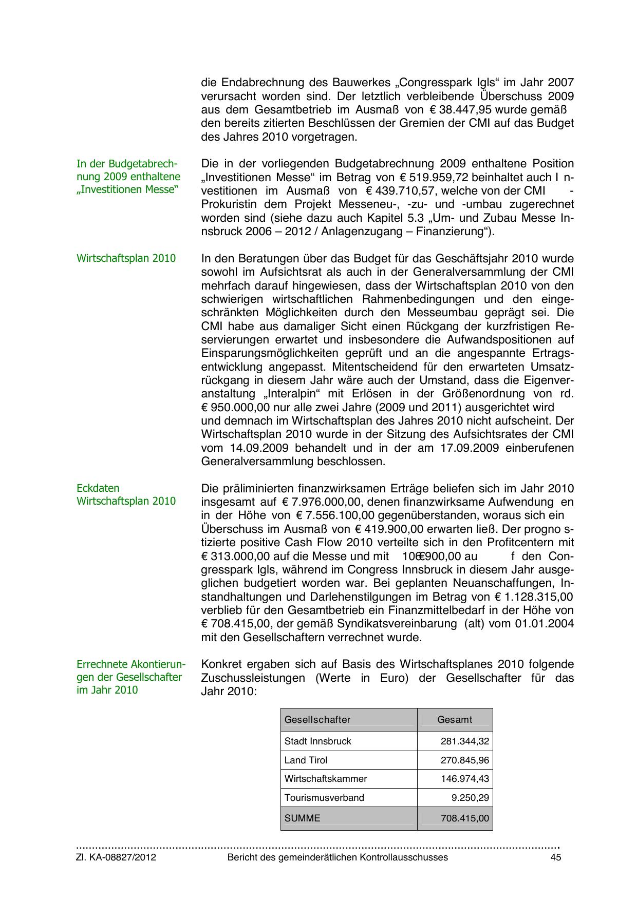 f den Congresspark Igls, während im Congress Innsbruck in diesem Jahr ausgeglichen budgetiert worden war. Bei geplanten Neuanschaffungen, Instandhaltungen und Darlehenstilgungen im Betrag von € 1.128.315,00