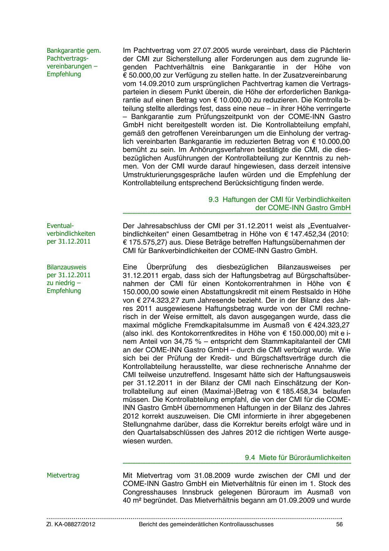müssen. Die Kontrollabteilung empfahl, die von der CMI für die COMEINN Gastro GmbH übernommenen Haftungen in der Bilanz des Jahres