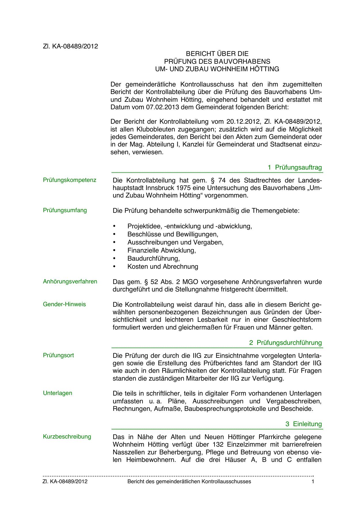 Die Kontrollabteilung hat gem. § 74 des Stadtrechtes der Landeshauptstadt Innsbruck 1975 eine Untersuchung des Bauvorhabens „Umund Zubau Wohnheim Hötting“ vorgenommen.