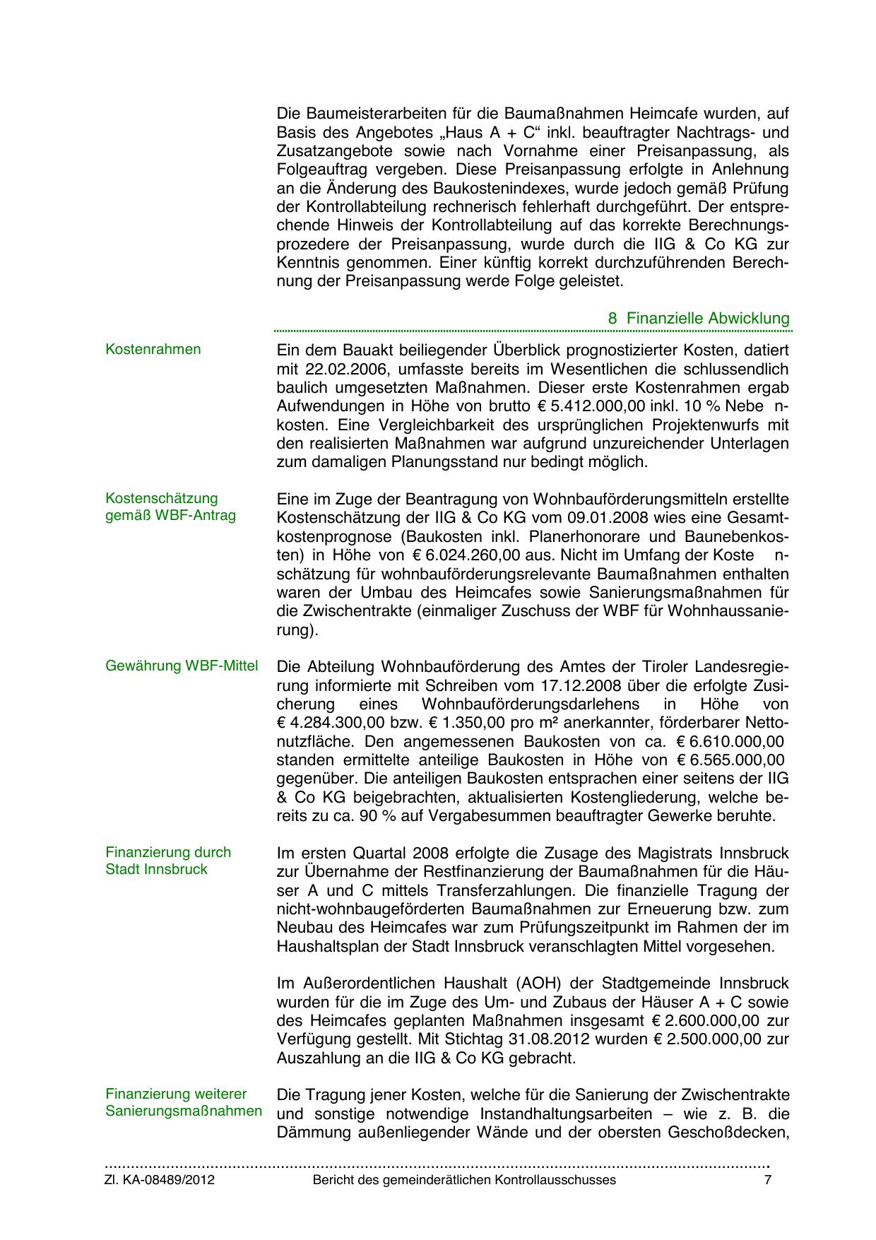 Kostenschätzung der IIG & Co KG vom 09.01.2008 wies eine Gesamtkostenprognose (Baukosten inkl. Planerhonorare und Baunebenkosten) in Höhe von € 6.024.260,00 aus. Nicht im Umfang der Koste nschätzung für wohnbauförderungsrelevante Baumaßnahmen enthalten