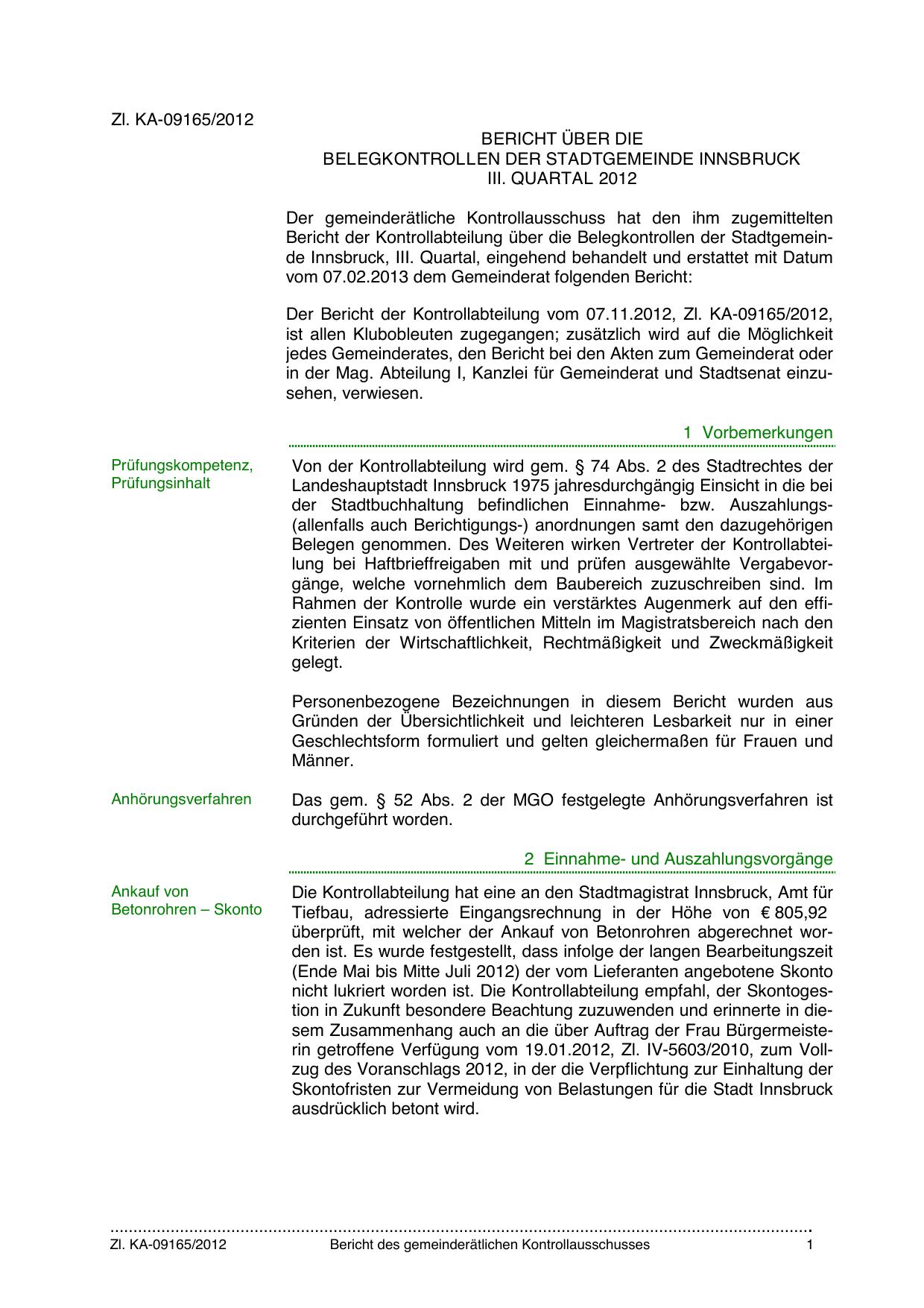 Der Bericht der Kontrollabteilung vom 07.11.2012, Zl. KA-09165/2012,