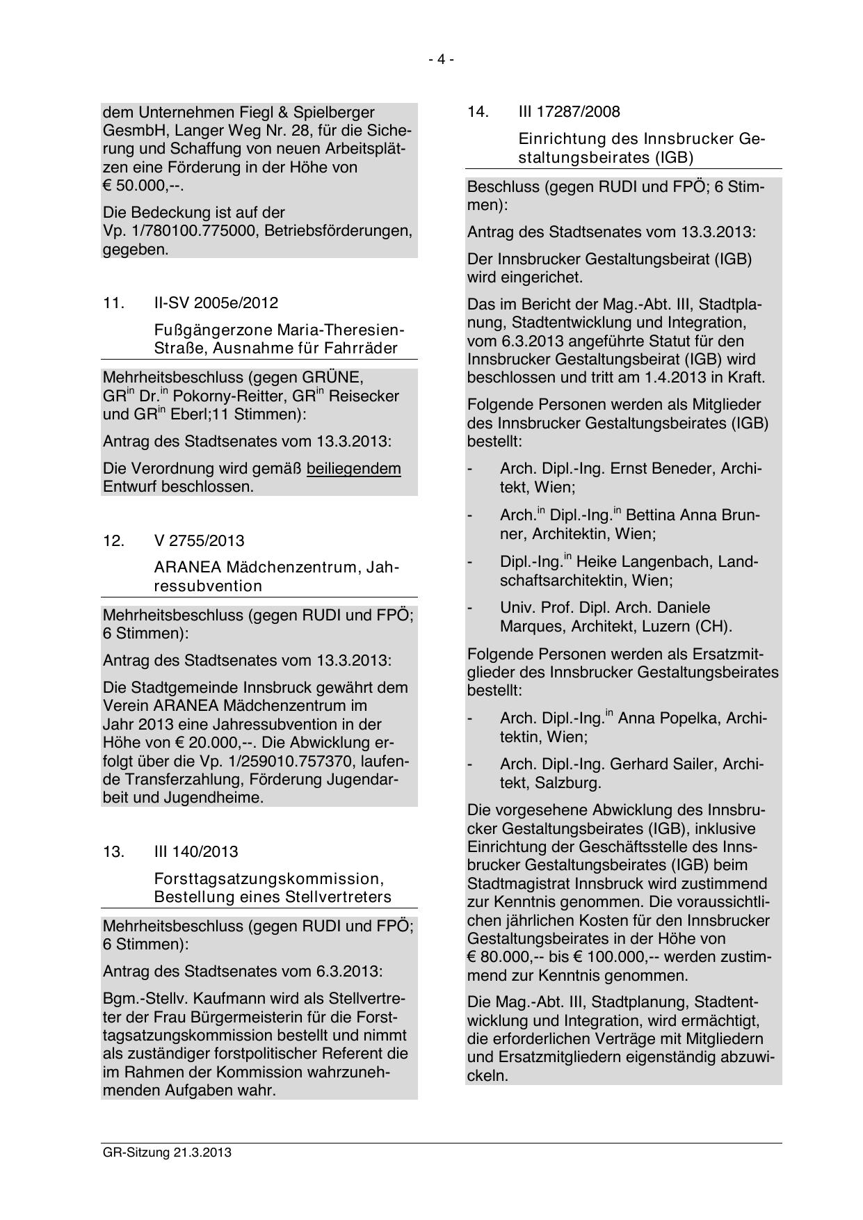 Beschluss (gegen RUDI und FPÖ; 6 Stimmen):