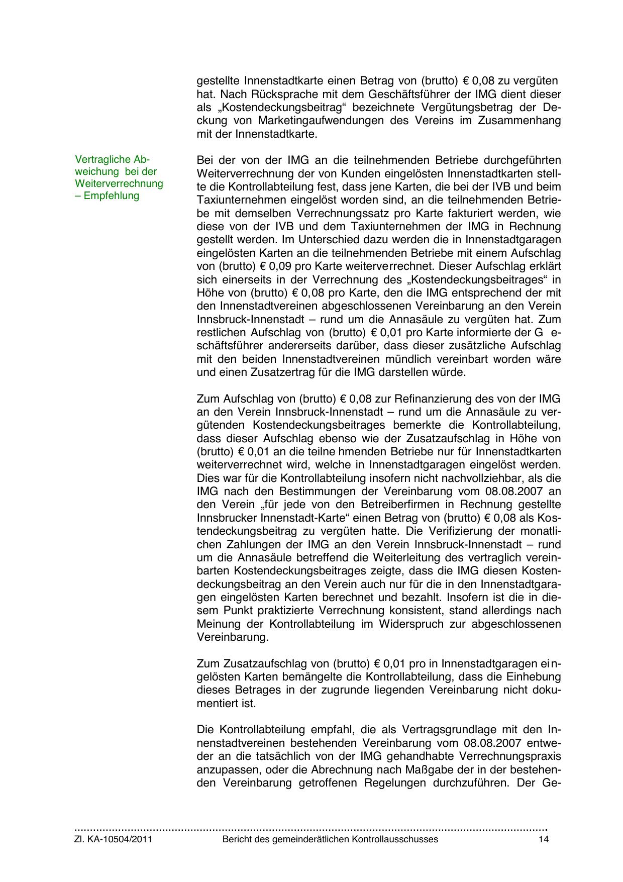 Innsbrucker Innenstadt-Karte“ einen Betrag von (brutto) € 0,08 als Kostendeckungsbeitrag zu vergüten hatte. Die Verifizierung der monatlichen Zahlungen der IMG an den Verein Innsbruck-Innenstadt – rund