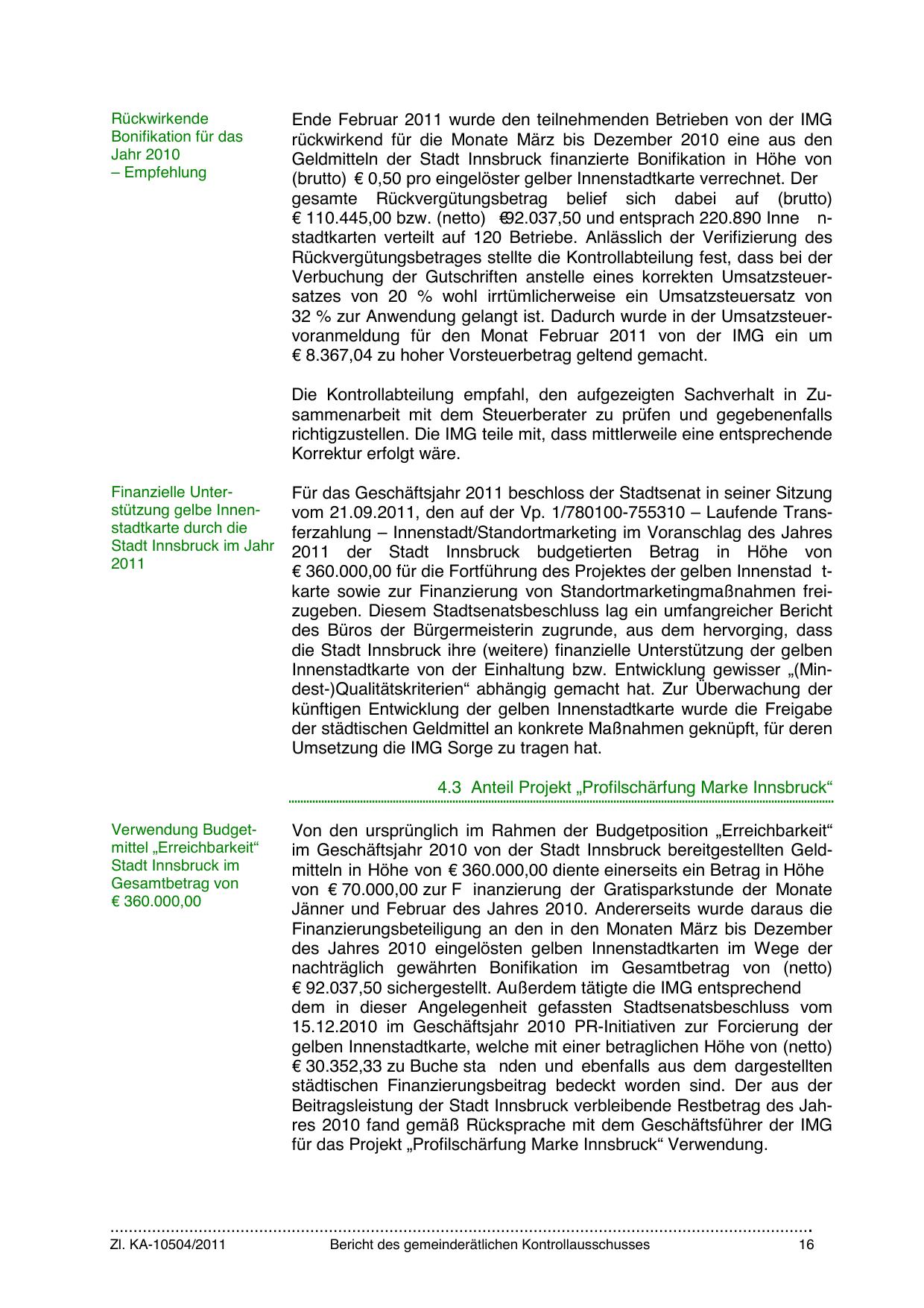 im Geschäftsjahr 2010 von der Stadt Innsbruck bereitgestellten Geldmitteln in Höhe von € 360.000,00 diente einerseits ein Betrag in Höhe