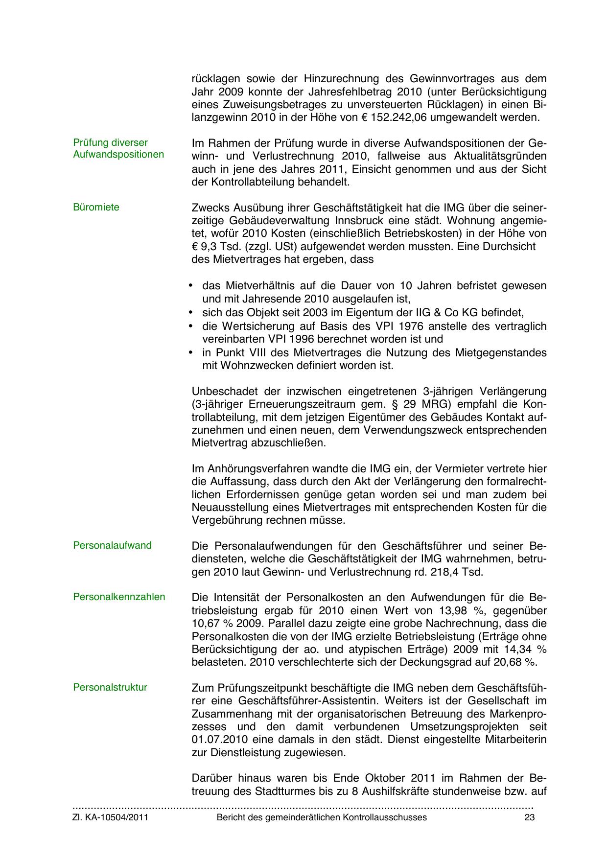 Die Personalaufwendungen für den Geschäftsführer und seiner Bediensteten, welche die Geschäftstätigkeit der IMG wahrnehmen, betrugen 2010 laut Gewinn- und Verlustrechnung rd. 218,4 Tsd.
