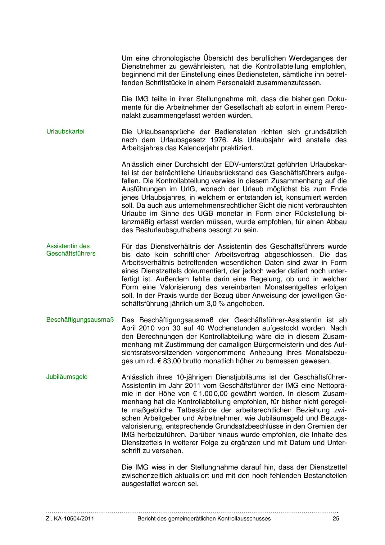 Anlässlich ihres 10-jährigen Dienstjubiläums ist der GeschäftsführerAssistentin im Jahr 2011 vom Geschäftsführer der IMG eine Nettoprämie in der Höhe von € 1.00 0,00 gewährt worden. In diesem Zusammenhang hat die Kontrollabteilung empfohlen, für bisher nicht geregelte maßgebliche Tatbestände der arbeitsrechtlichen Beziehung zwischen Arbeitgeber und Arbeitnehmer, wie Jubiläumsgeld und Bezugsvalorisierung, entsprechende Grundsatzbeschlüsse in den Gremien der