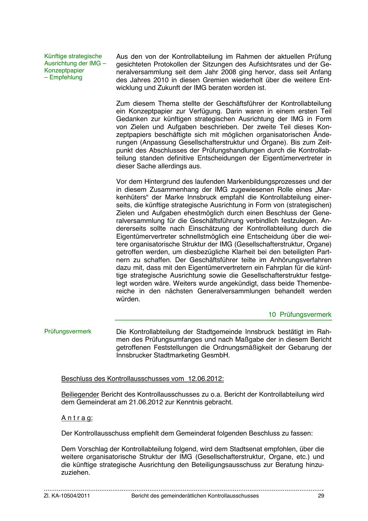 Die Kontrollabteilung der Stadtgemeinde Innsbruck bestätigt im Rahmen des Prüfungsumfanges und nach Maßgabe der in diesem Bericht