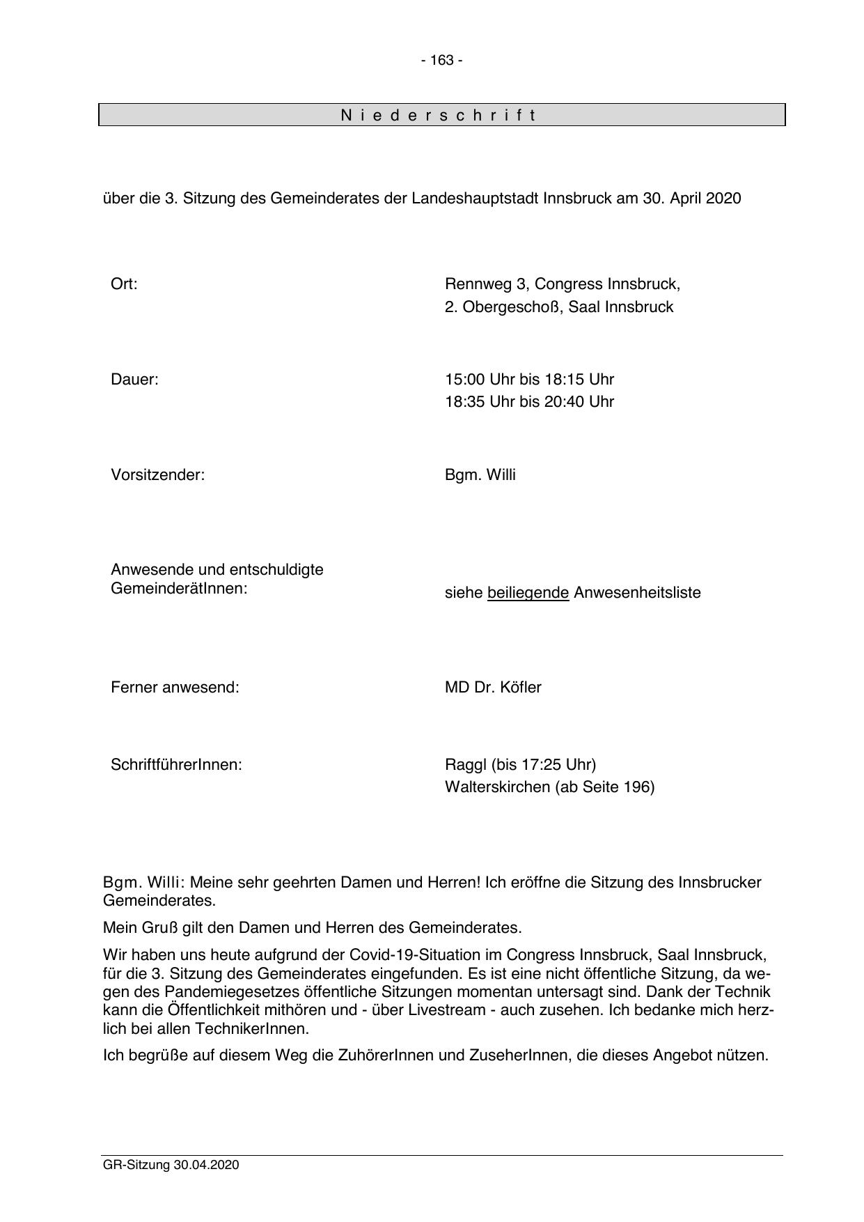 über die 3. Sitzung des Gemeinderates der Landeshauptstadt Innsbruck am 30. April 2020