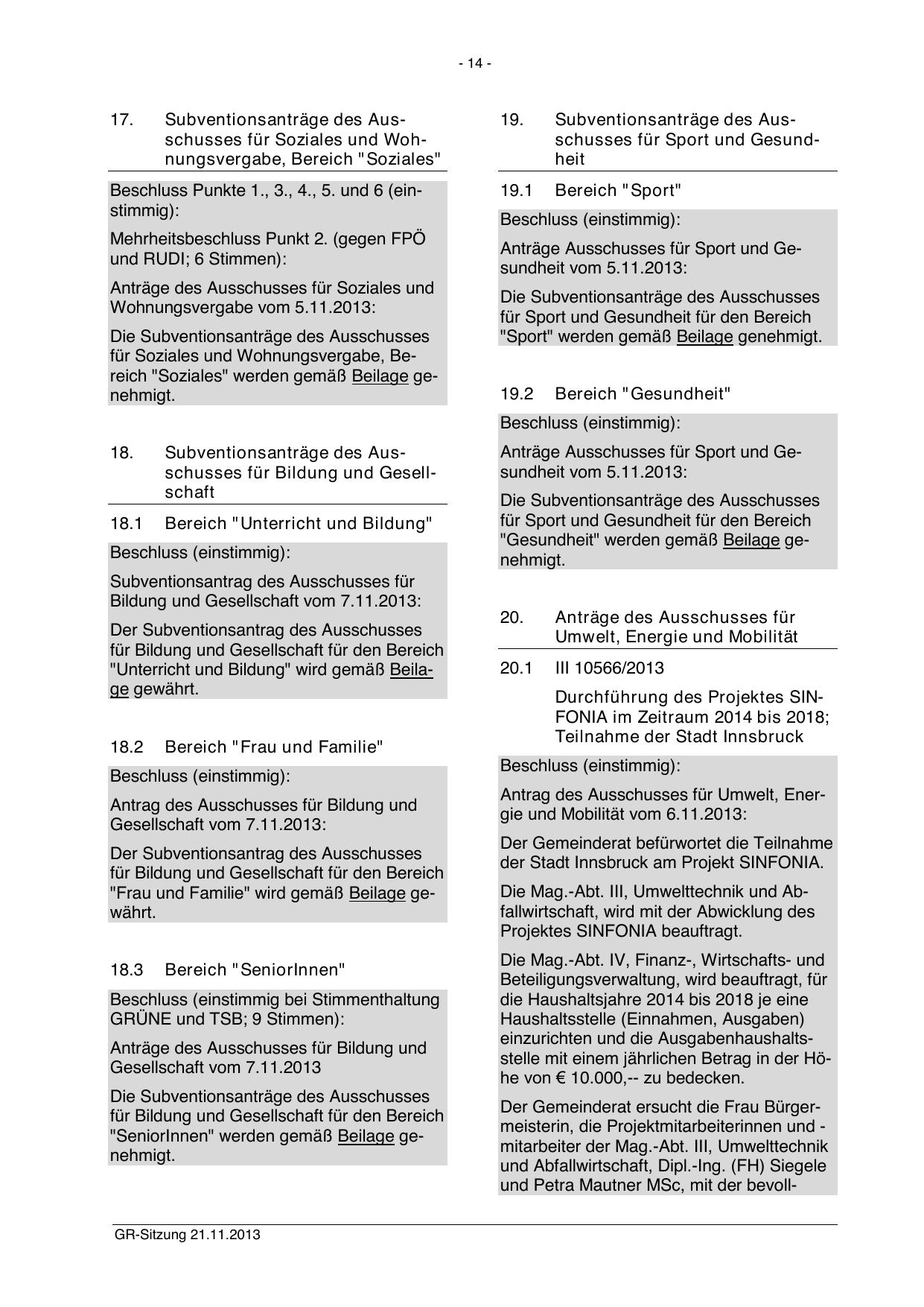 Anträge Ausschusses für Sport und Gesundheit vom 5.11.2013: