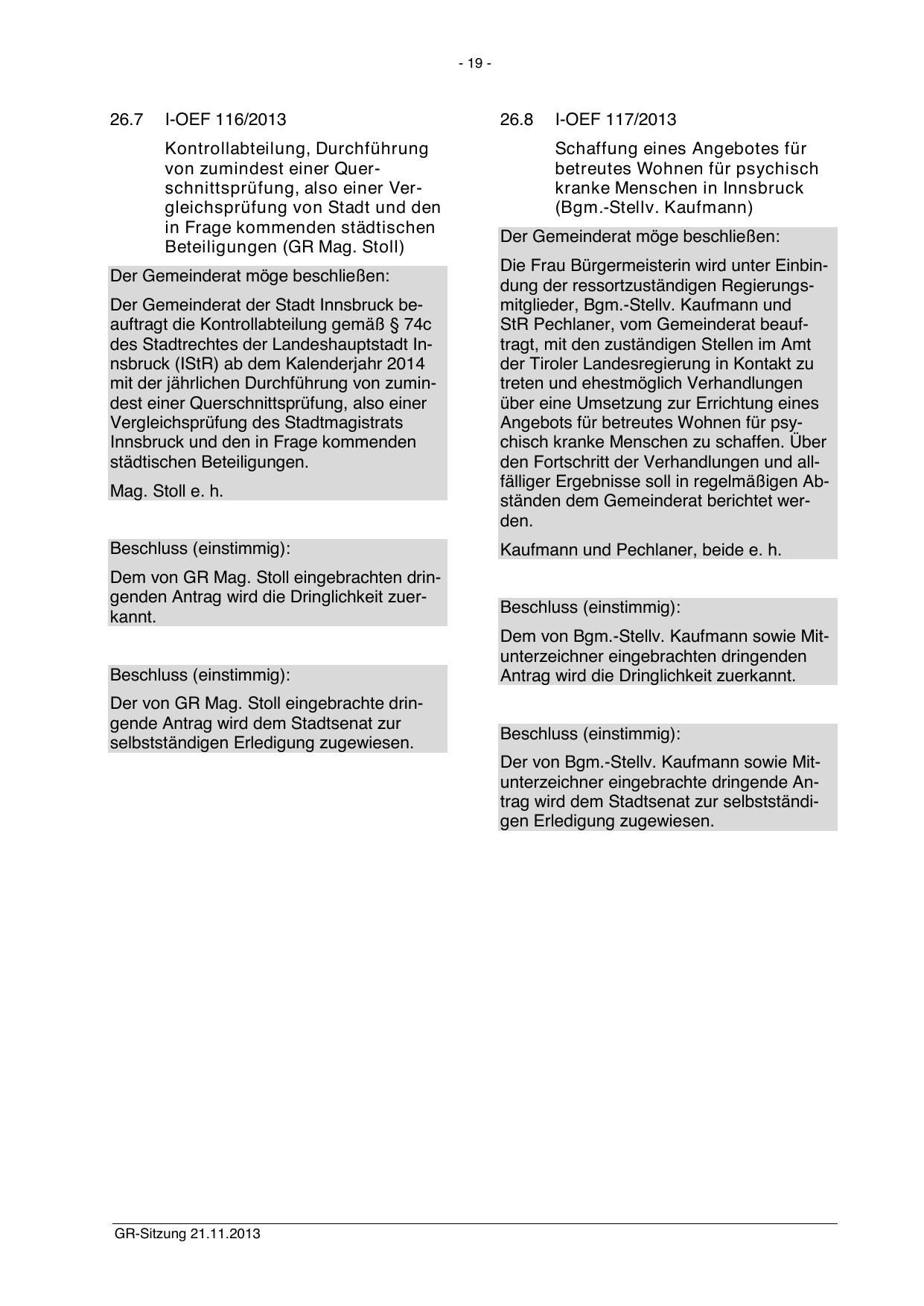 Der Gemeinderat der Stadt Innsbruck beauftragt die Kontrollabteilung gemäß § 74c