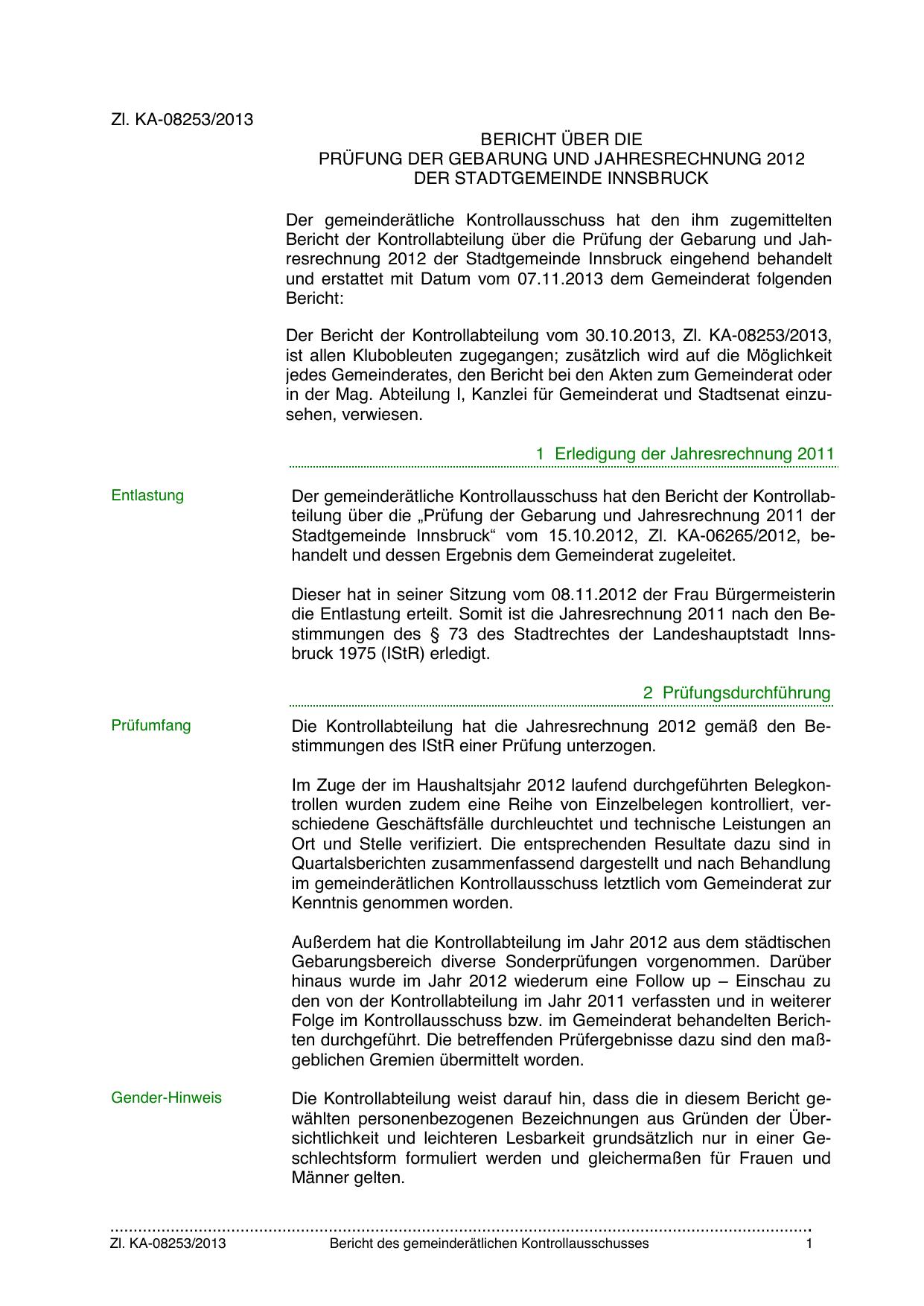 Stadtgemeinde Innsbruck“ vom 15.10.2012, Zl. KA-06265/2012, behandelt und dessen Ergebnis dem Gemeinderat zugeleitet.