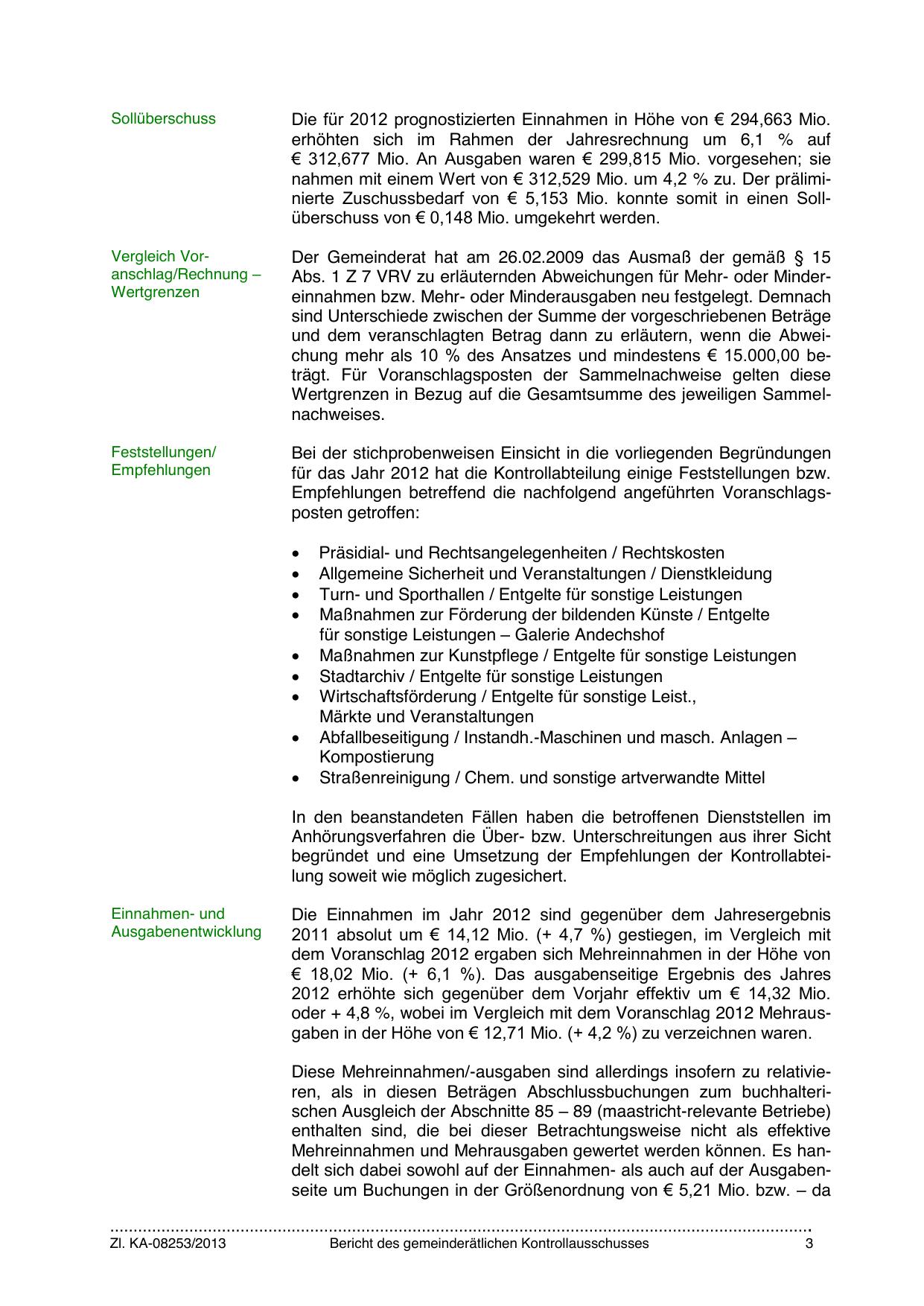 oder + 4,8 %, wobei im Vergleich mit dem Voranschlag 2012 Mehrausgaben in der Höhe von € 12,71 Mio. (+ 4,2 %) zu verzeichnen waren.