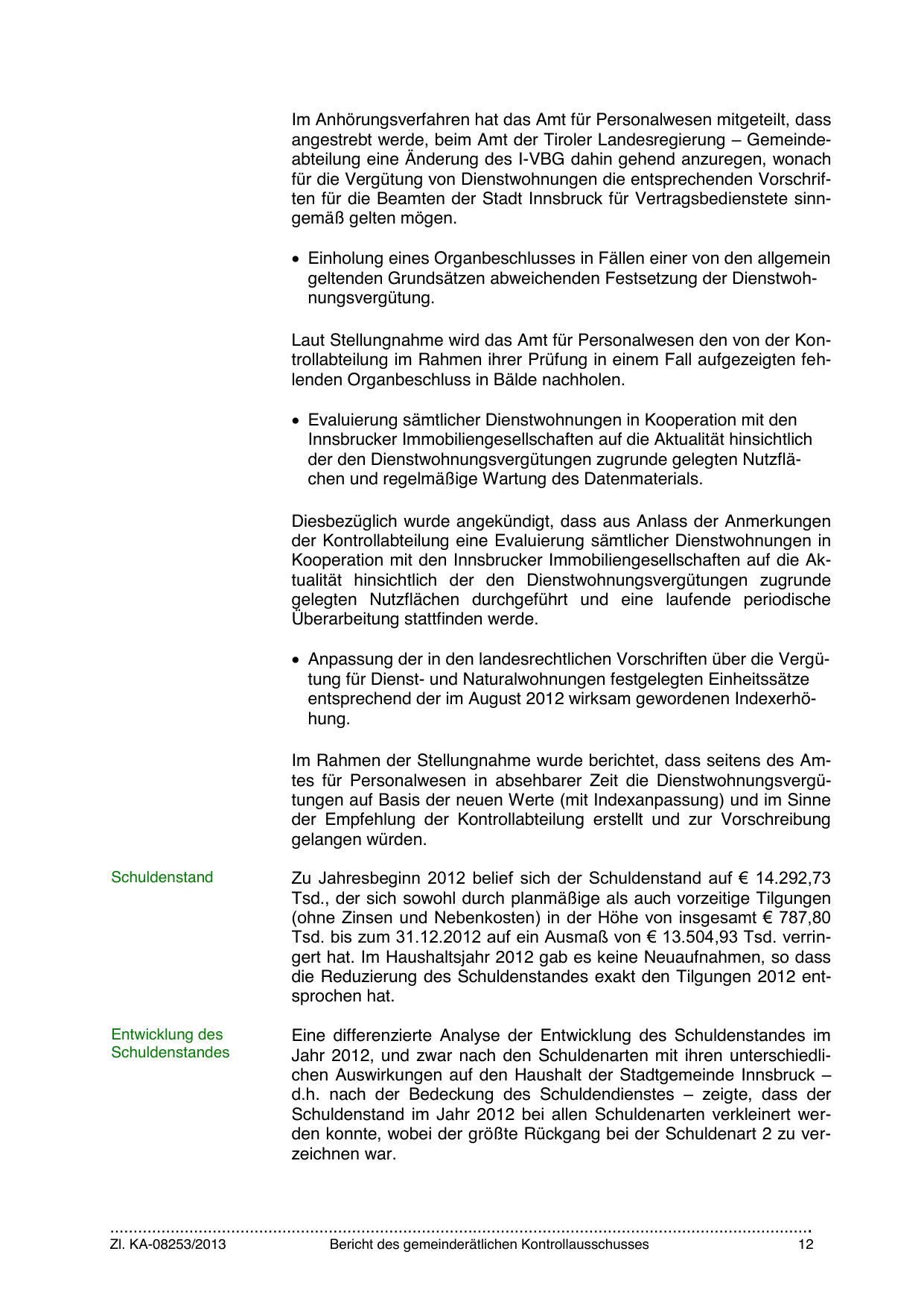 Tsd. bis zum 31.12.2012 auf ein Ausmaß von € 13.504,93 Tsd. verringert hat. Im Haushaltsjahr 2012 gab es keine Neuaufnahmen, so dass