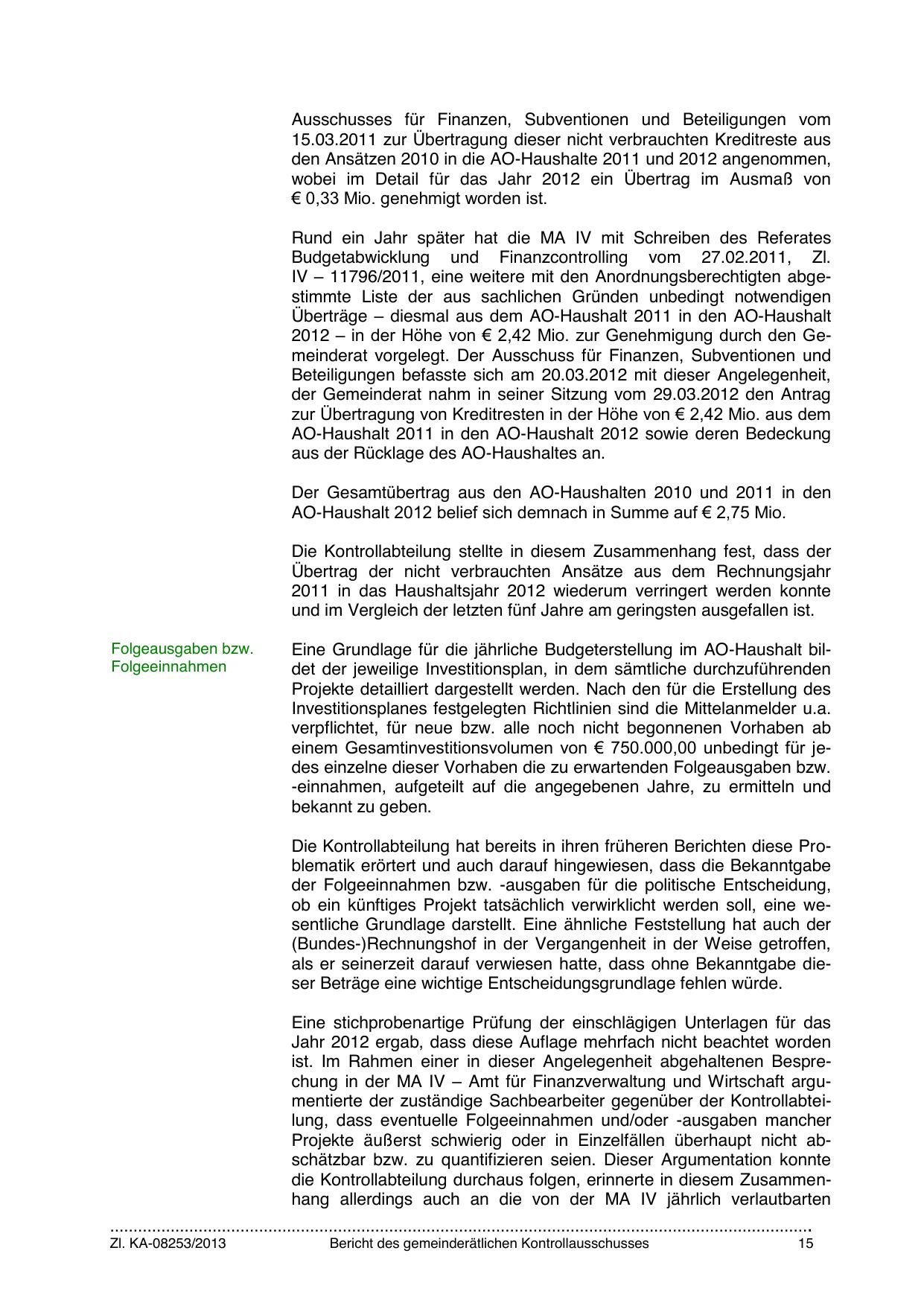 2012 – in der Höhe von € 2,42 Mio. zur Genehmigung durch den Gemeinderat vorgelegt. Der Ausschuss für Finanzen, Subventionen und