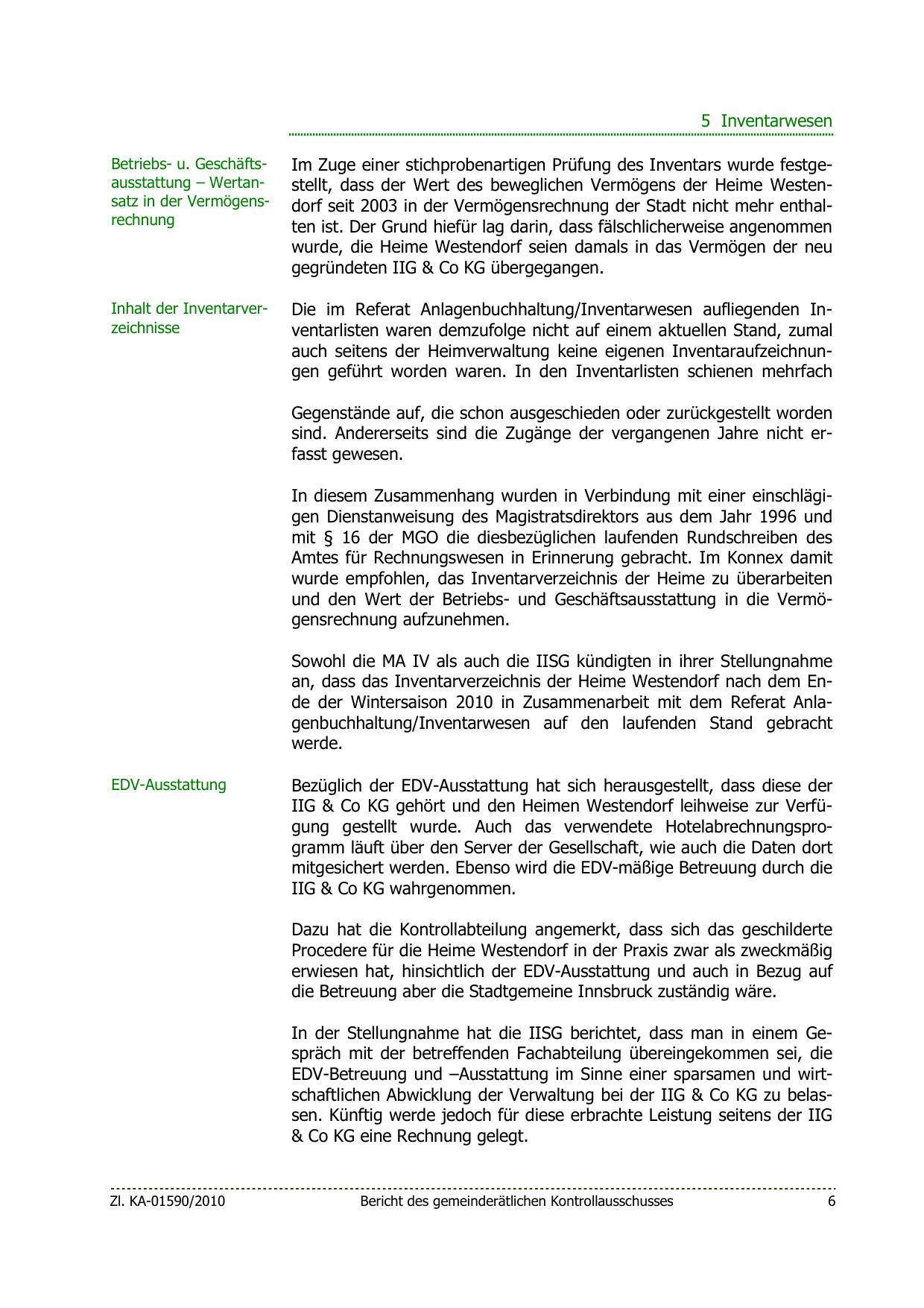 Im Zuge einer stichprobenartigen Prüfung des Inventars wurde festgestellt, dass der Wert des beweglichen Vermögens der Heime Westendorf seit 2003 in der Vermögensrechnung der Stadt nicht mehr enthalten ist. Der Grund hiefür lag darin, dass fälschlicherweise angenommen