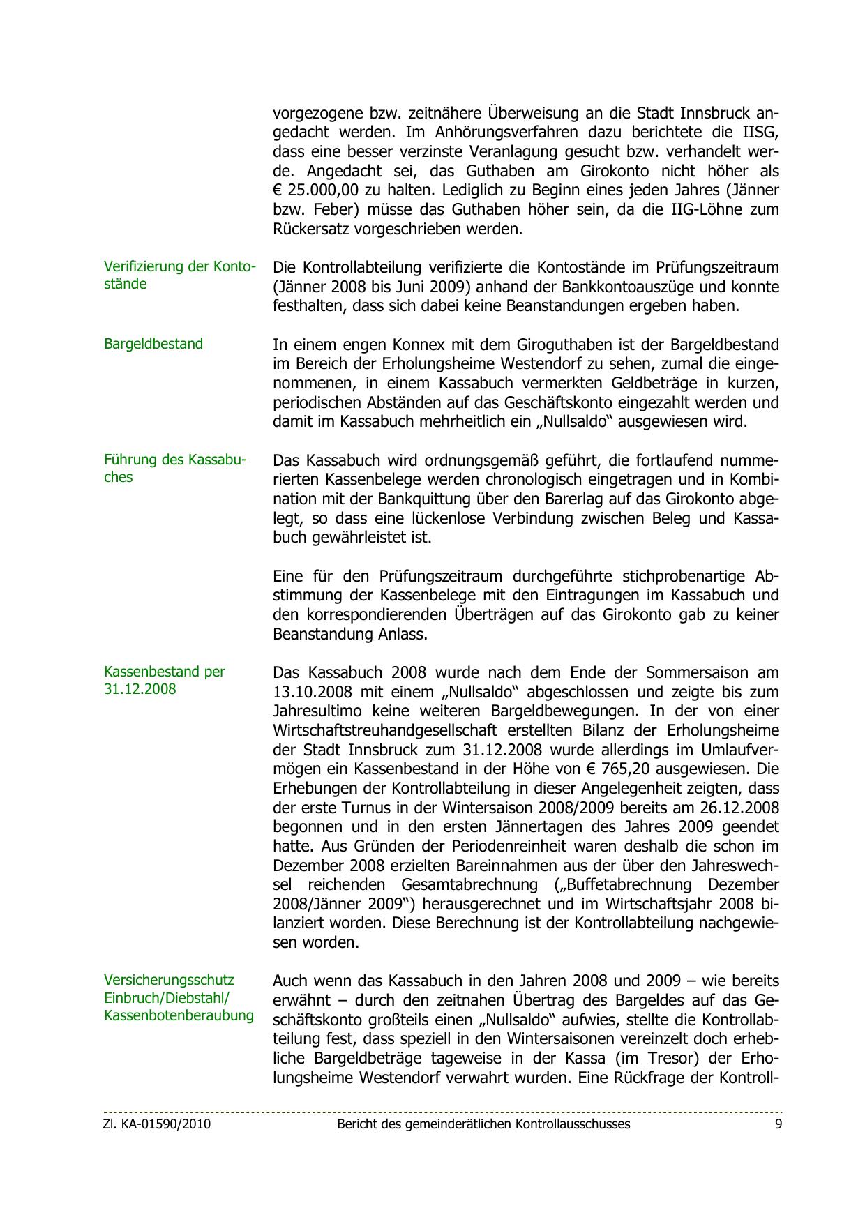 der Stadt Innsbruck zum 31.12.2008 wurde allerdings im Umlaufvermögen ein Kassenbestand in der Höhe von € 765,20 ausgewiesen. Die