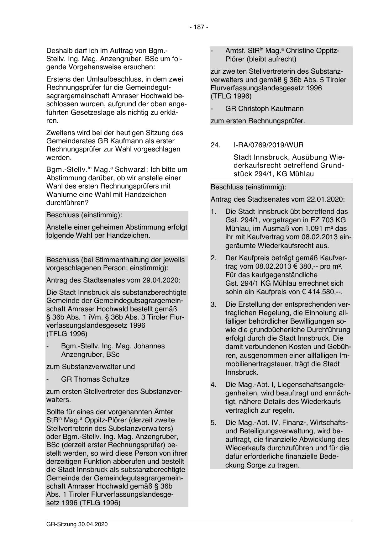 Rechnungsprüfer für die Gemeindegutsagrargemeinschaft Amraser Hochwald beschlossen wurden, aufgrund der oben angeführten Gesetzeslage als nichtig zu erklären.
