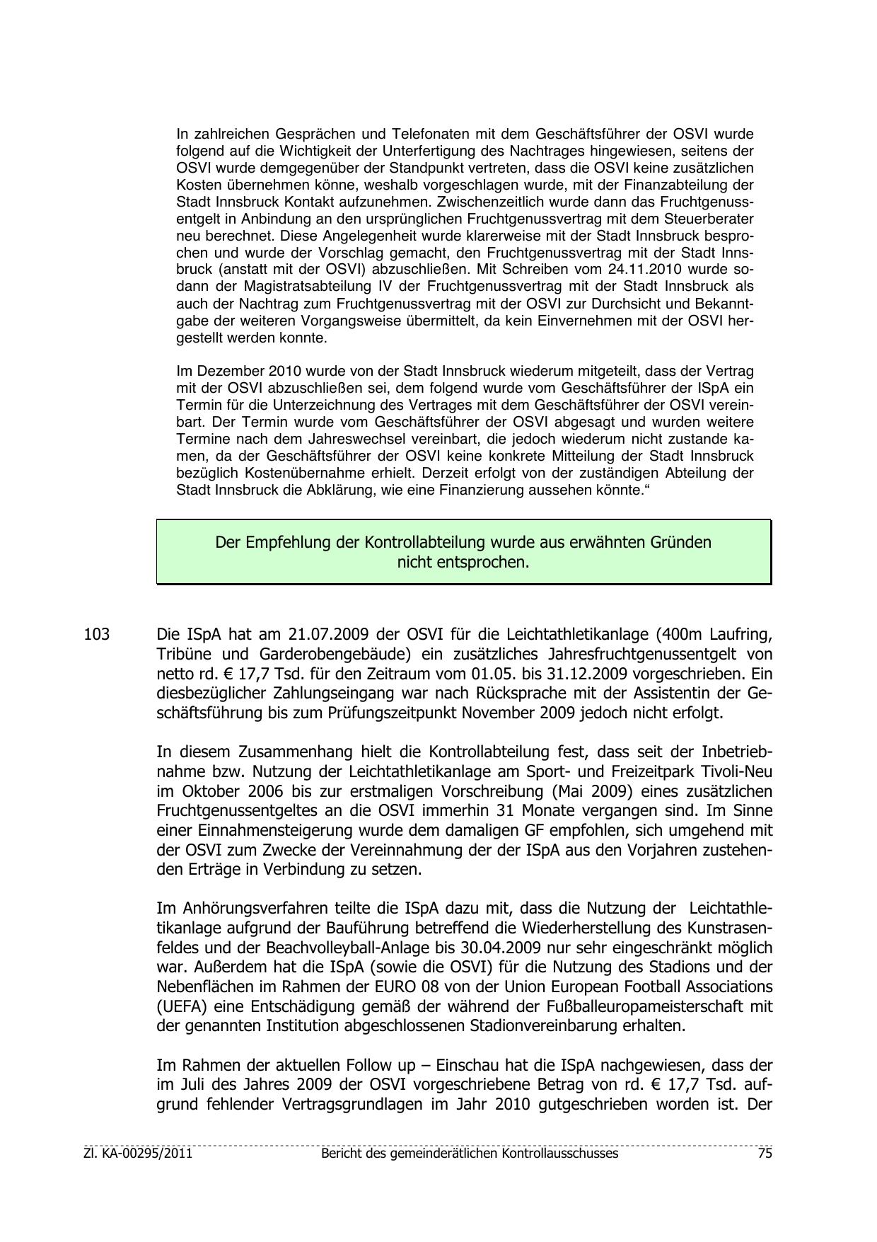 Im Dezember 2010 wurde von der Stadt Innsbruck wiederum mitgeteilt, dass der Vertrag