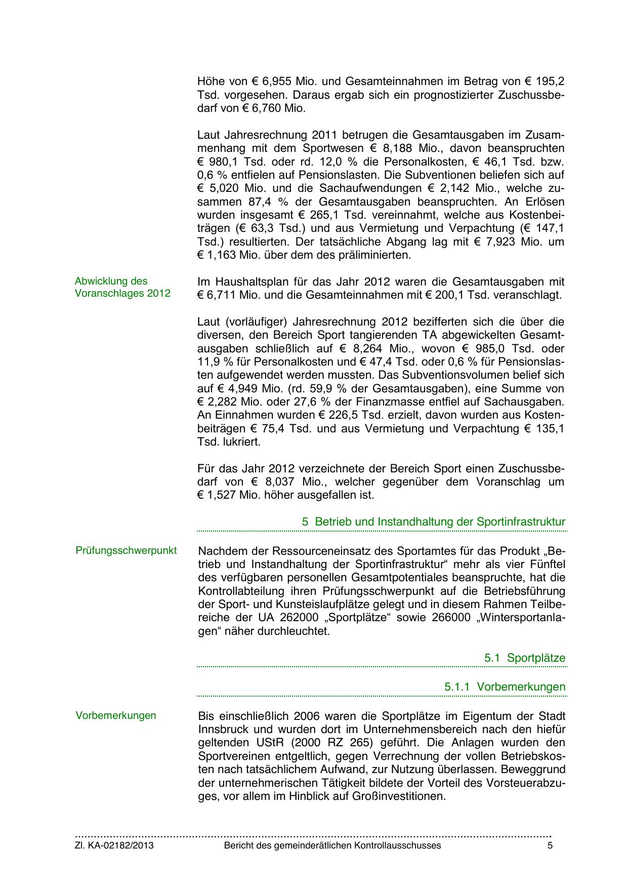 Für das Jahr 2012 verzeichnete der Bereich Sport einen Zuschussbedarf von € 8,037 Mio., welcher gegenüber dem Voranschlag um