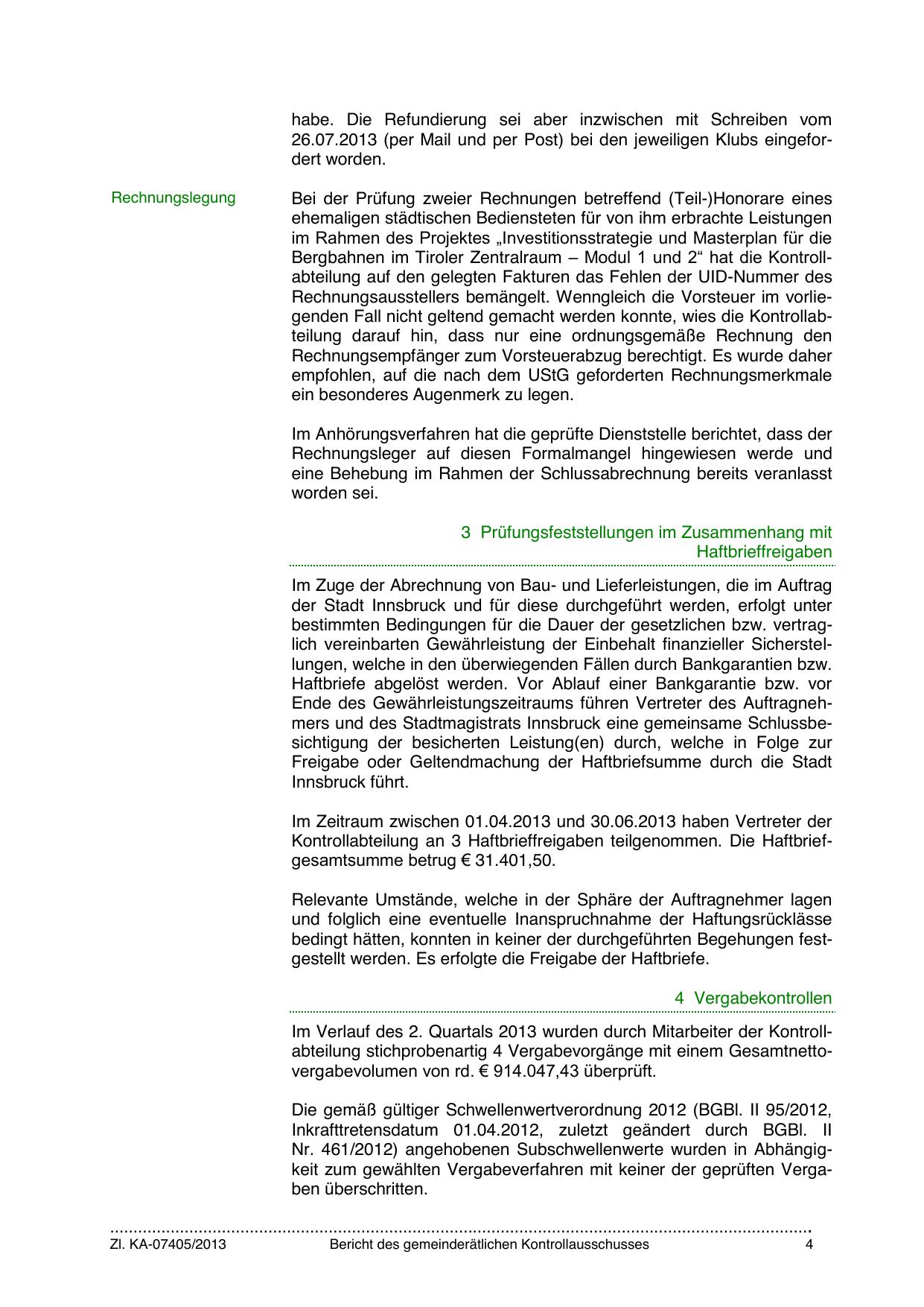 Im Verlauf des 2. Quartals 2013 wurden durch Mitarbeiter der Kontrollabteilung stichprobenartig 4 Vergabevorgänge mit einem Gesamtnettovergabevolumen von rd. € 914.047,43 überprüft.