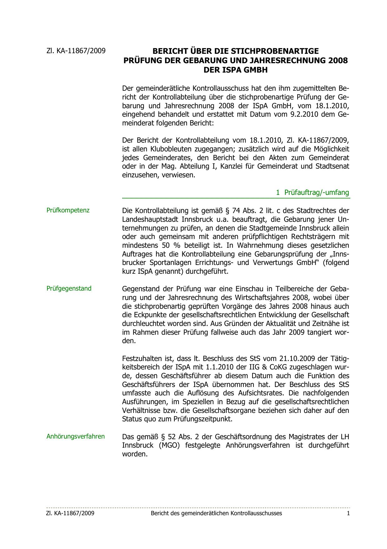 Der gemeinderätliche Kontrollausschuss hat den ihm zugemittelten Bericht der Kontrollabteilung über die stichprobenartige Prüfung der Gebarung und Jahresrechnung 2008 der ISpA GmbH, vom 18.1.2010,