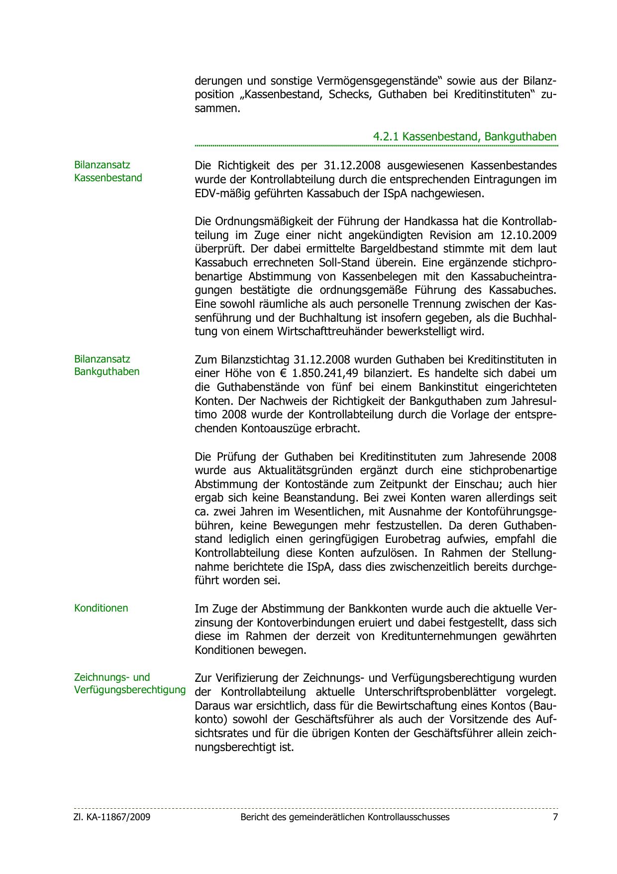 Konten. Der Nachweis der Richtigkeit der Bankguthaben zum Jahresultimo 2008 wurde der Kontrollabteilung durch die Vorlage der entsprechenden Kontoauszüge erbracht.