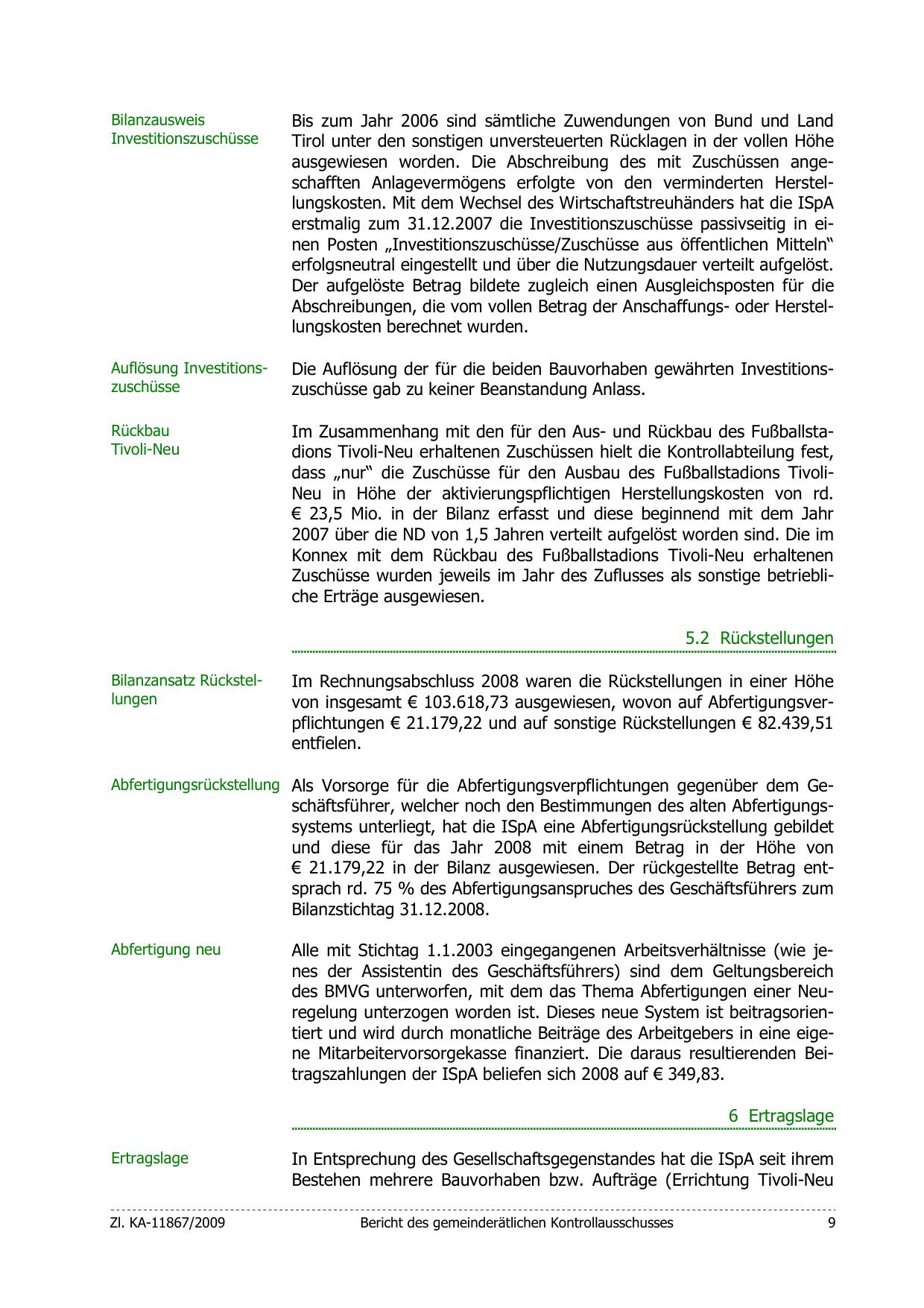 Im Zusammenhang mit den für den Aus- und Rückbau des Fußballstadions Tivoli-Neu erhaltenen Zuschüssen hielt die Kontrollabteilung fest,