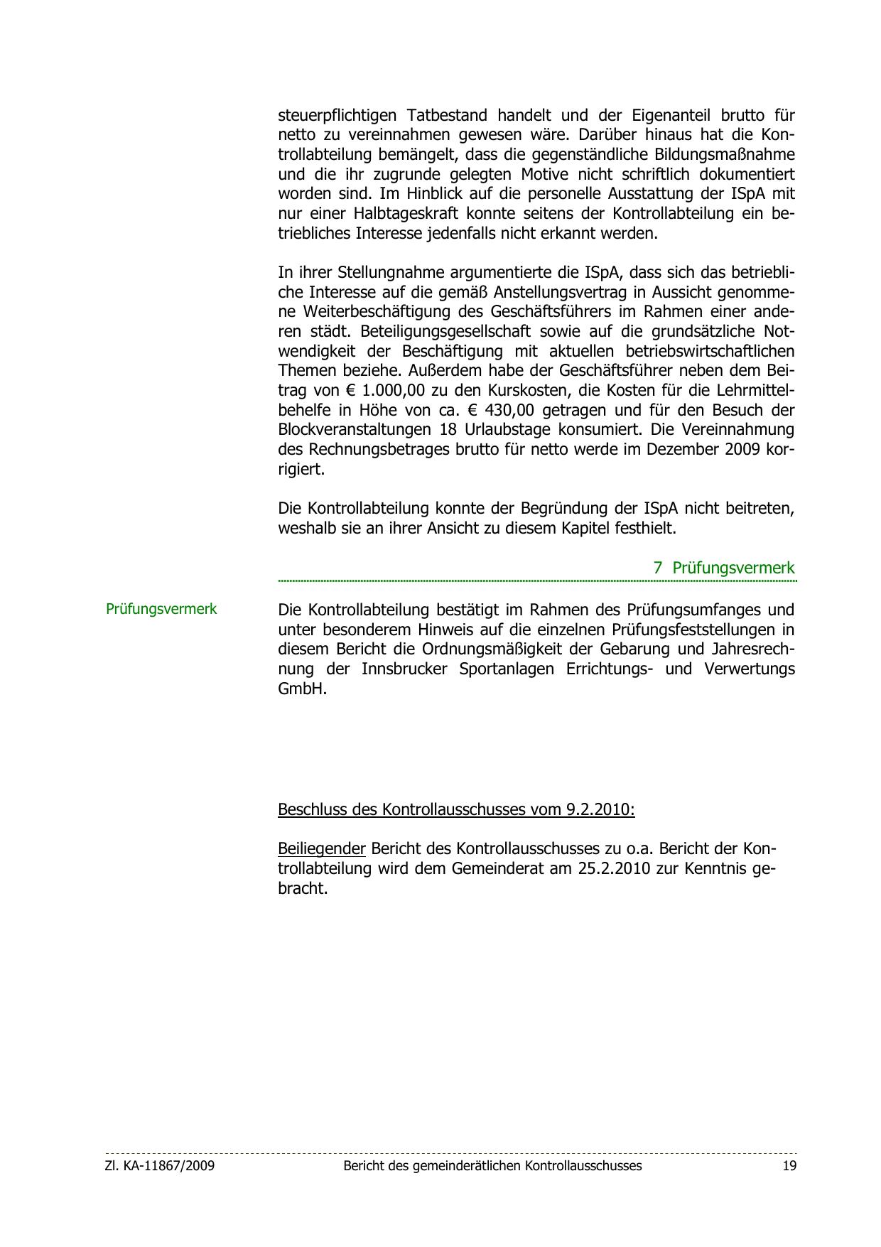 diesem Bericht die Ordnungsmäßigkeit der Gebarung und Jahresrechnung der Innsbrucker Sportanlagen Errichtungs- und Verwertungs