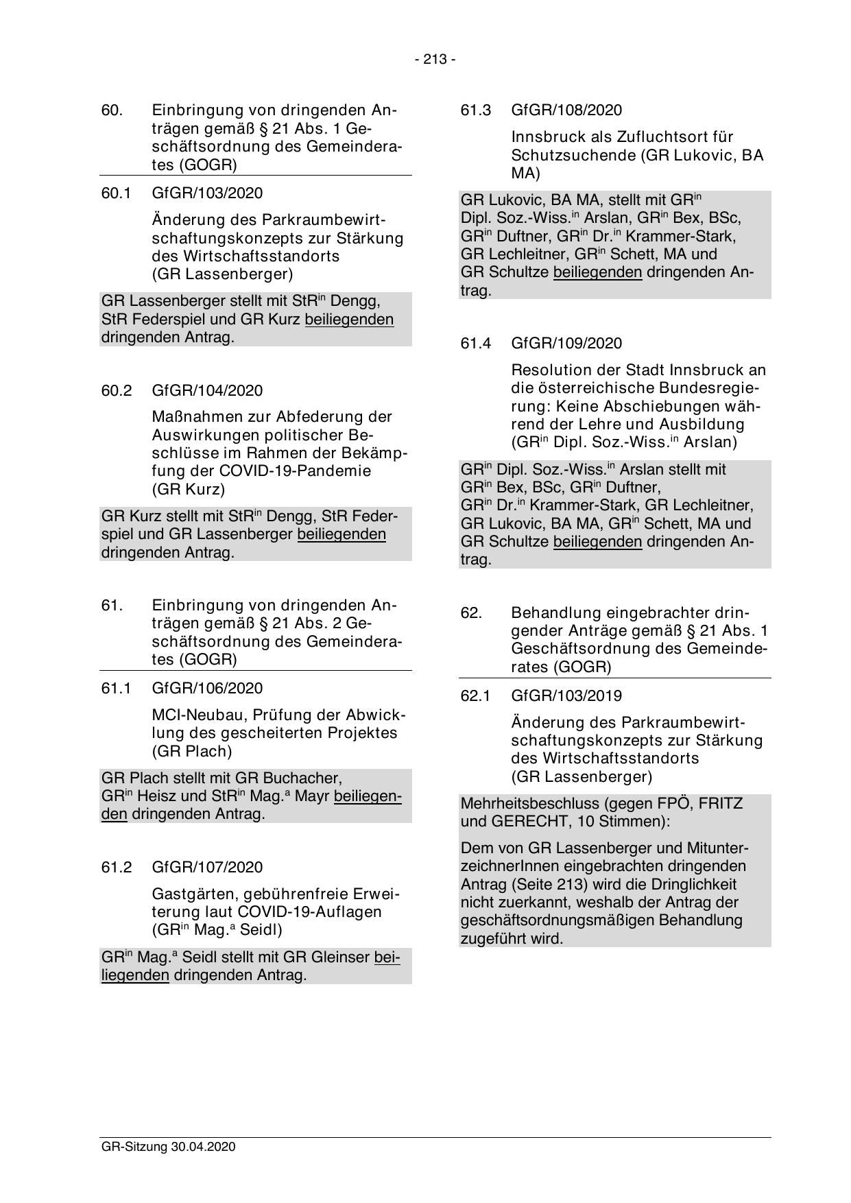Einbringung von dringenden Anträgen gemäß § 21 Abs. 2 Geschäftsordnung des Gemeinderates (GOGR)
