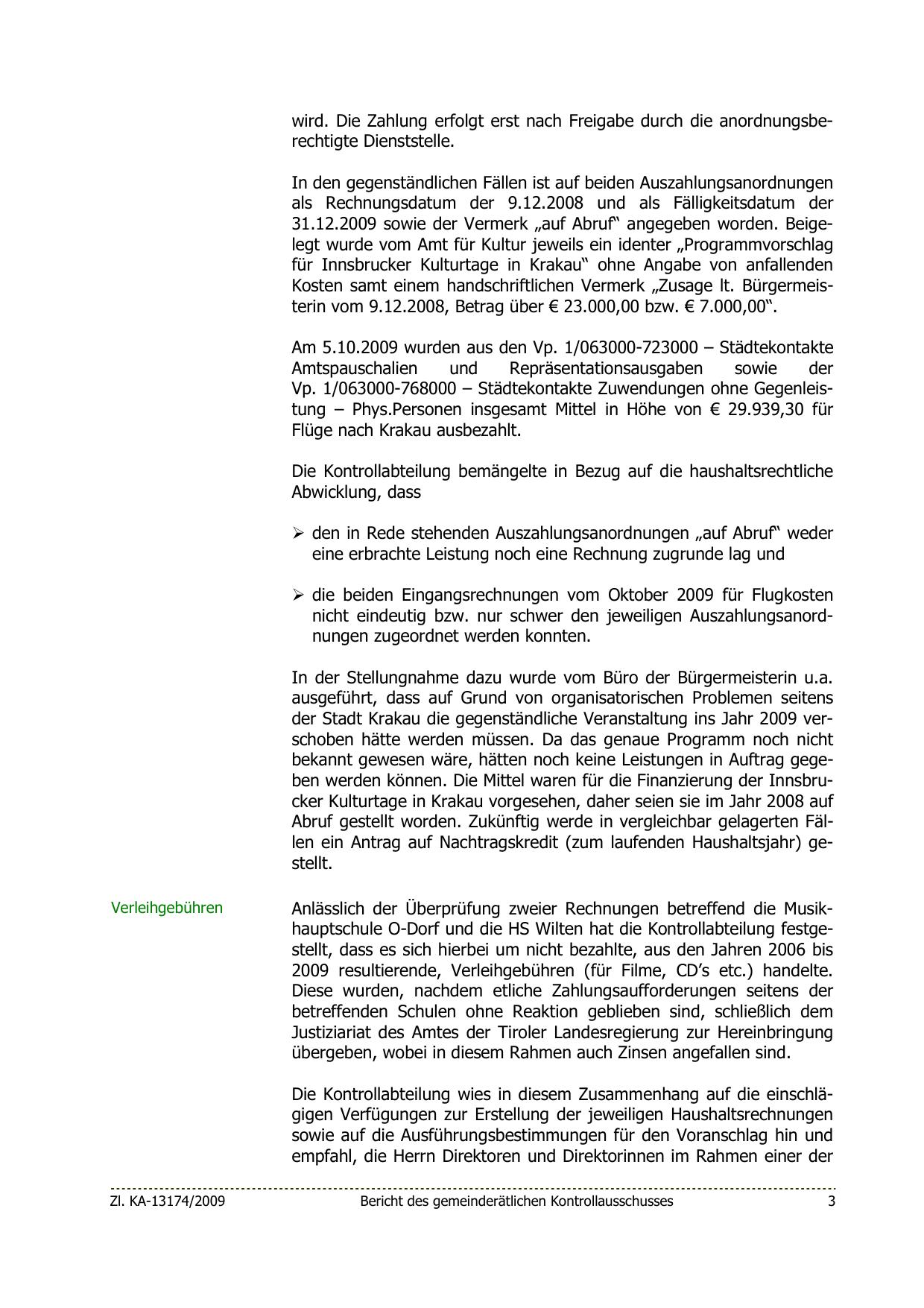 bekannt gewesen wäre, hätten noch keine Leistungen in Auftrag gegeben werden können. Die Mittel waren für die Finanzierung der Innsbrucker Kulturtage in Krakau vorgesehen, daher seien sie im Jahr 2008 auf