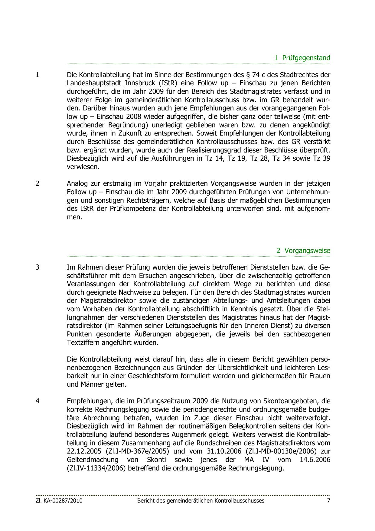 weiterer Folge im gemeinderätlichen Kontrollausschuss bzw. im GR behandelt wurden. Darüber hinaus wurden auch jene Empfehlungen aus der vorangegangenen Follow up – Einschau 2008 wieder aufgegriffen, die bisher ganz oder teilweise (mit entsprechender Begründung) unerledigt geblieben waren bzw. zu denen angekündigt