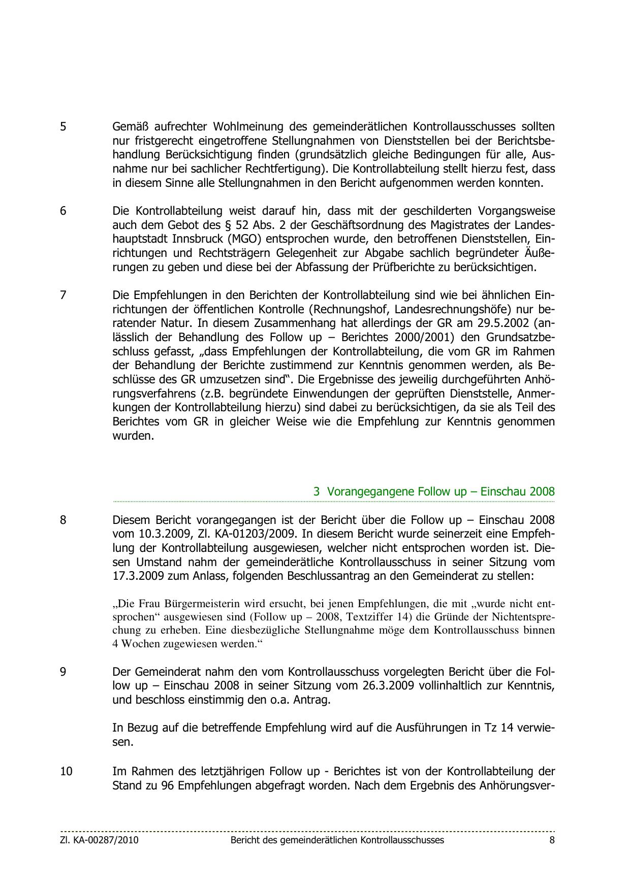 auch dem Gebot des § 52 Abs. 2 der Geschäftsordnung des Magistrates der Landeshauptstadt Innsbruck (MGO) entsprochen wurde, den betroffenen Dienststellen, Einrichtungen und Rechtsträgern Gelegenheit zur Abgabe sachlich begründeter Äußerungen zu geben und diese bei der Abfassung der Prüfberichte zu berücksichtigen.