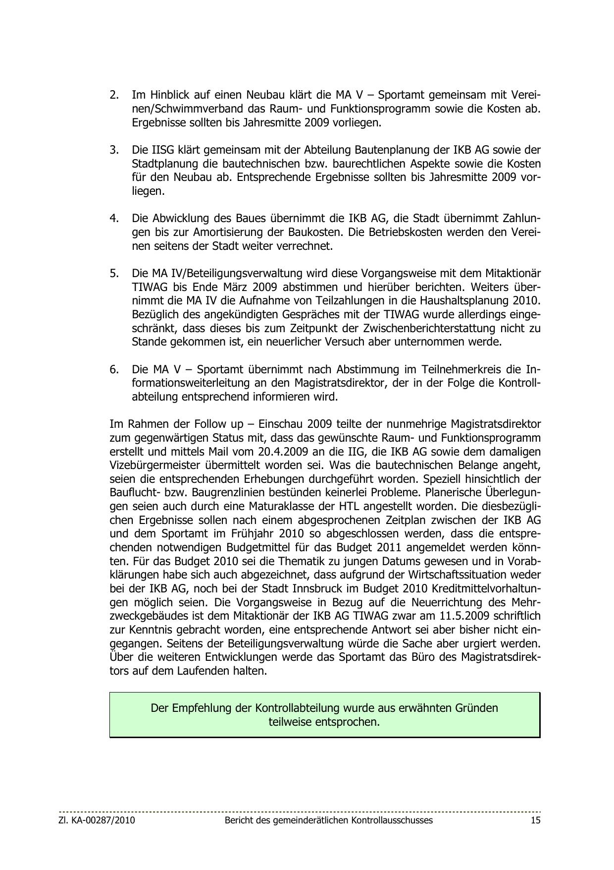 TIWAG bis Ende März 2009 abstimmen und hierüber berichten. Weiters übernimmt die MA IV die Aufnahme von Teilzahlungen in die Haushaltsplanung 2010.