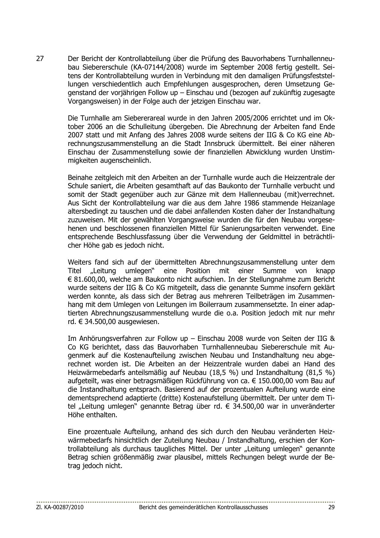 2007 statt und mit Anfang des Jahres 2008 wurde seitens der IIG & Co KG eine Abrechnungszusammenstellung an die Stadt Innsbruck übermittelt. Bei einer näheren