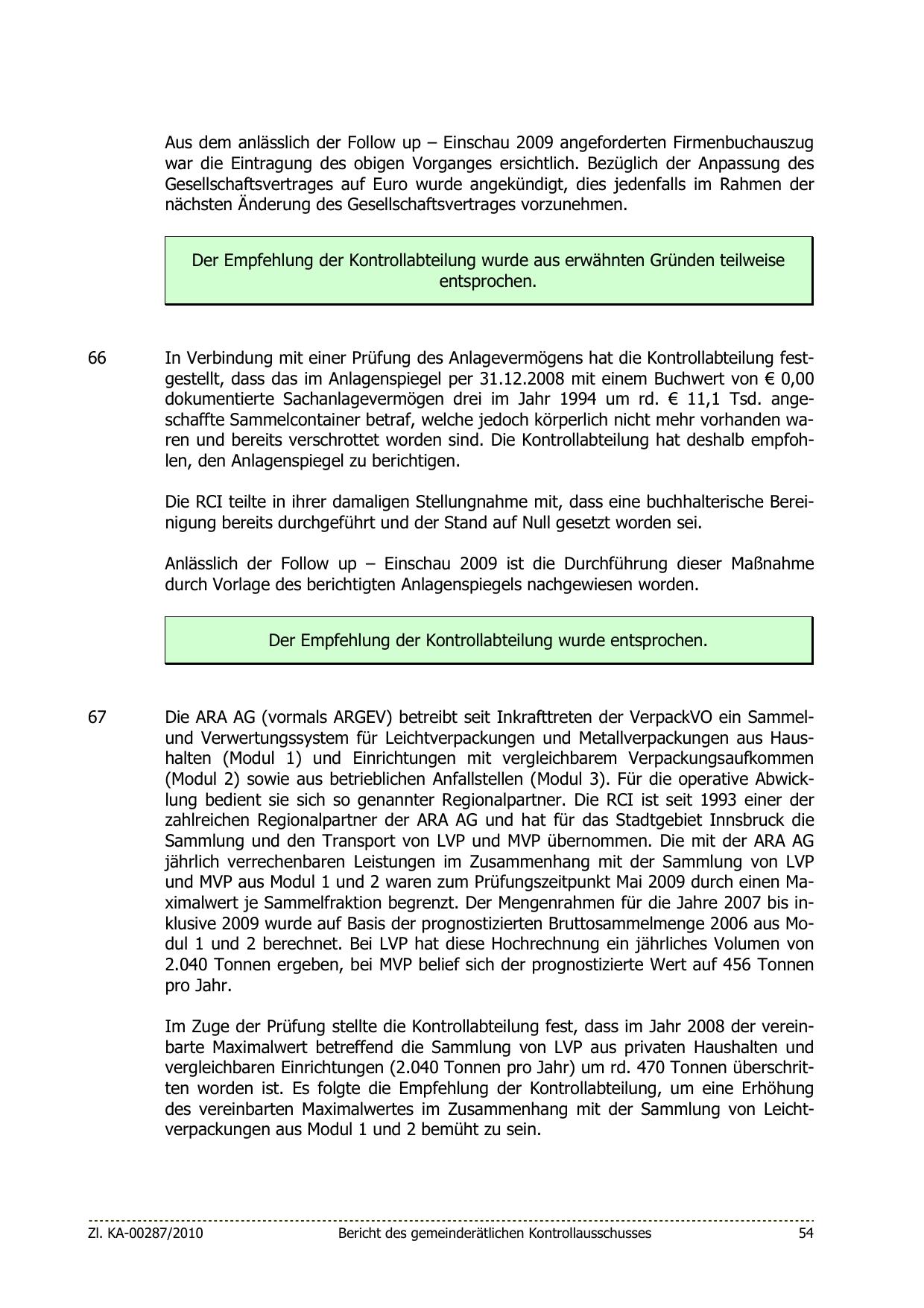 Im Zuge der Prüfung stellte die Kontrollabteilung fest, dass im Jahr 2008 der vereinbarte Maximalwert betreffend die Sammlung von LVP aus privaten Haushalten und