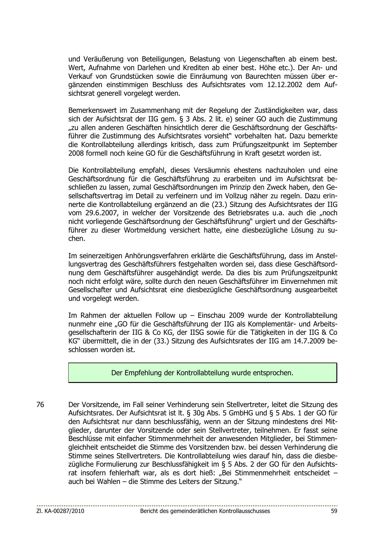 KG“ übermittelt, die in der (33.) Sitzung des Aufsichtsrates der IIG am 14.7.2009 beschlossen worden ist.