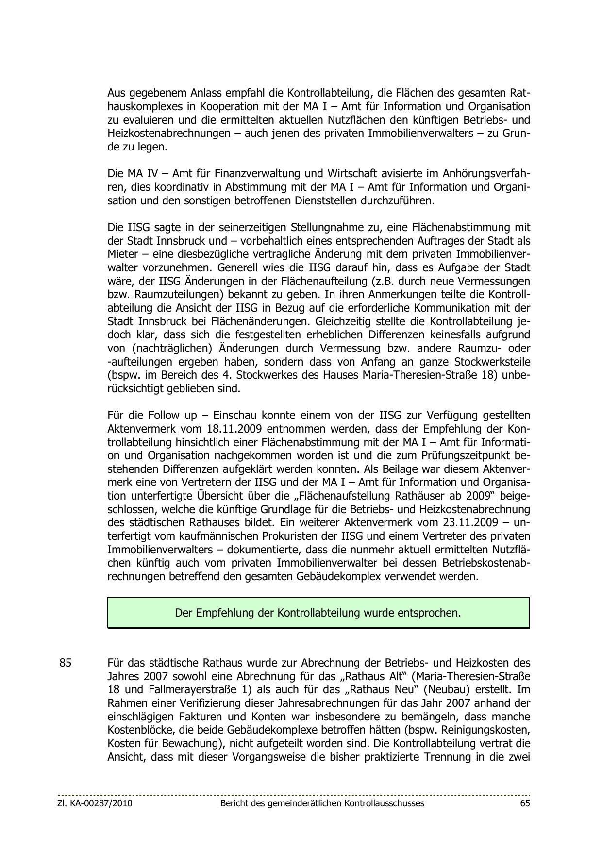 Aktenvermerk vom 18.11.2009 entnommen werden, dass der Empfehlung der Kontrollabteilung hinsichtlich einer Flächenabstimmung mit der MA I – Amt für Information und Organisation nachgekommen worden ist und die zum Prüfungszeitpunkt bestehenden Differenzen aufgeklärt werden konnten. Als Beilage war diesem Aktenvermerk eine von Vertretern der IISG und der MA I – Amt für Information und Organisation unterfertigte Übersicht über die „Flächenaufstellung Rathäuser ab 2009“ beigeschlossen, welche die künftige Grundlage für die Betriebs- und Heizkostenabrechnung