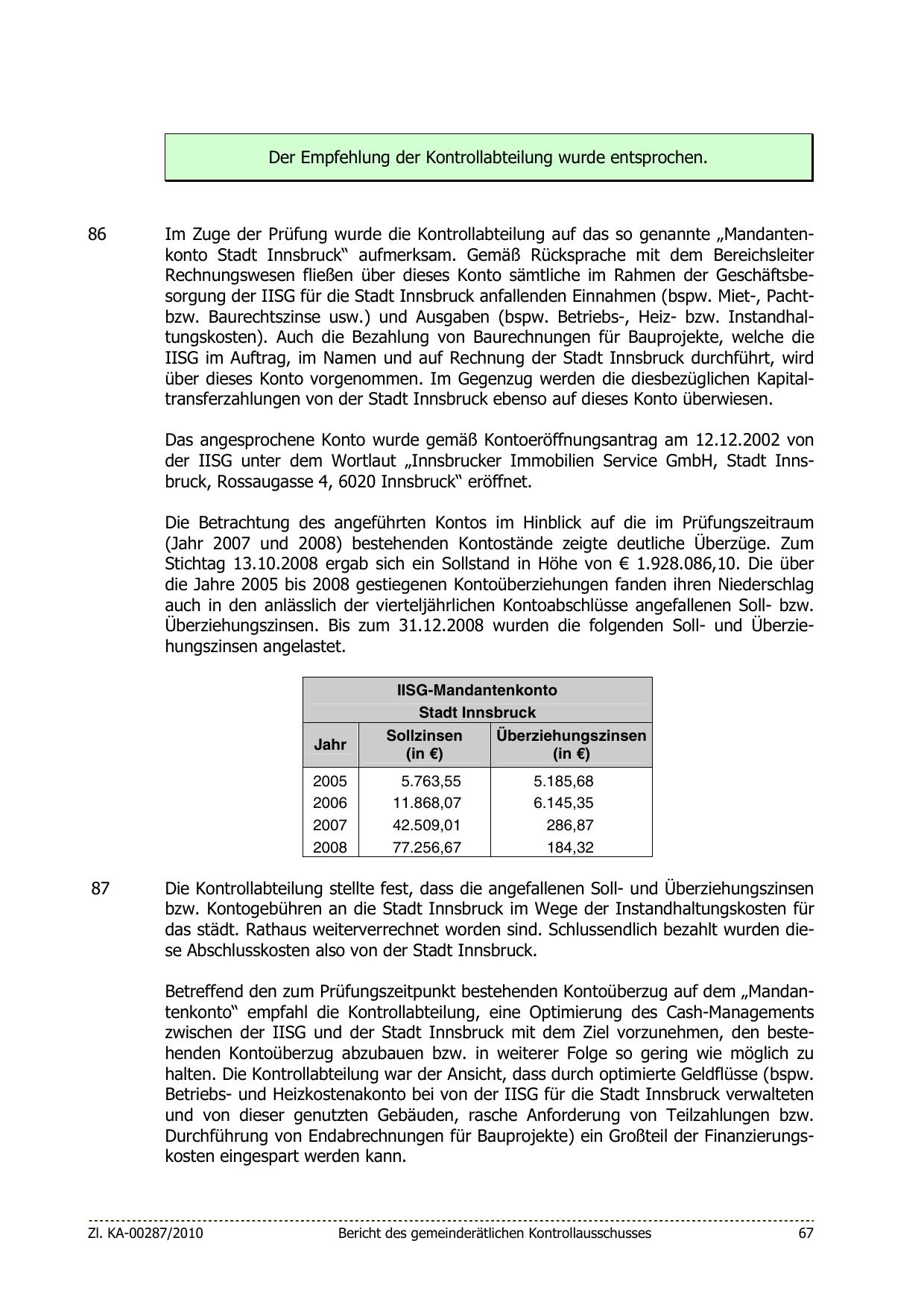 zwischen der IISG und der Stadt Innsbruck mit dem Ziel vorzunehmen, den bestehenden Kontoüberzug abzubauen bzw. in weiterer Folge so gering wie möglich zu