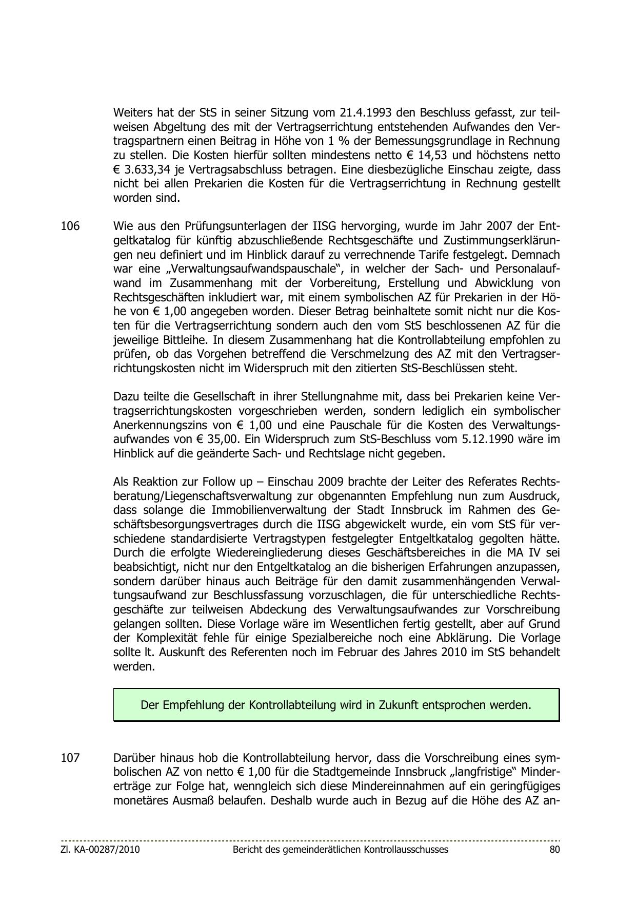 Darüber hinaus hob die Kontrollabteilung hervor, dass die Vorschreibung eines symbolischen AZ von netto € 1,00 für die Stadtgemeinde Innsbruck „langfristige“ Mindererträge zur Folge hat, wenngleich sich diese Mindereinnahmen auf ein geringfügiges