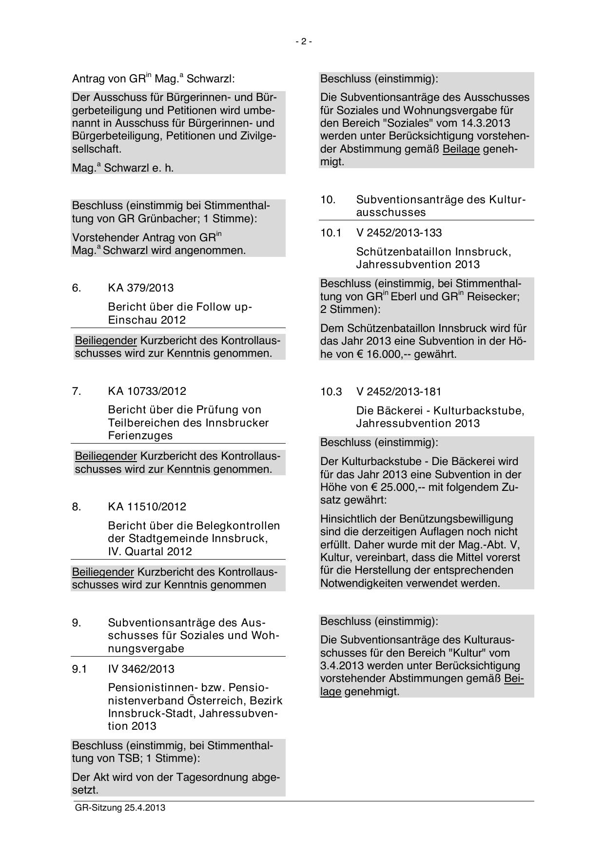 Beschluss (einstimmig, bei Stimmenthaltung von GRin Eberl und GRin Reisecker;