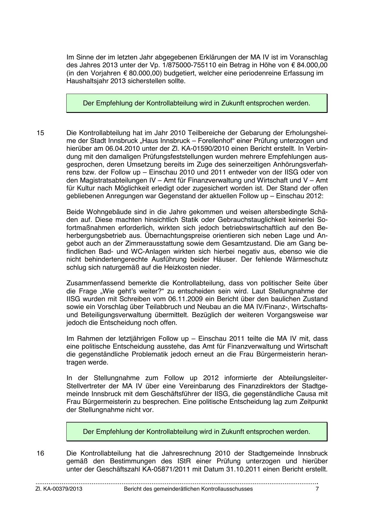 Die Kontrollabteilung hat im Jahr 2010 Teilbereiche der Gebarung der Erholungsheime der Stadt Innsbruck „Haus Innsbruck – Forellenhof“ einer Prüfung unterzogen und