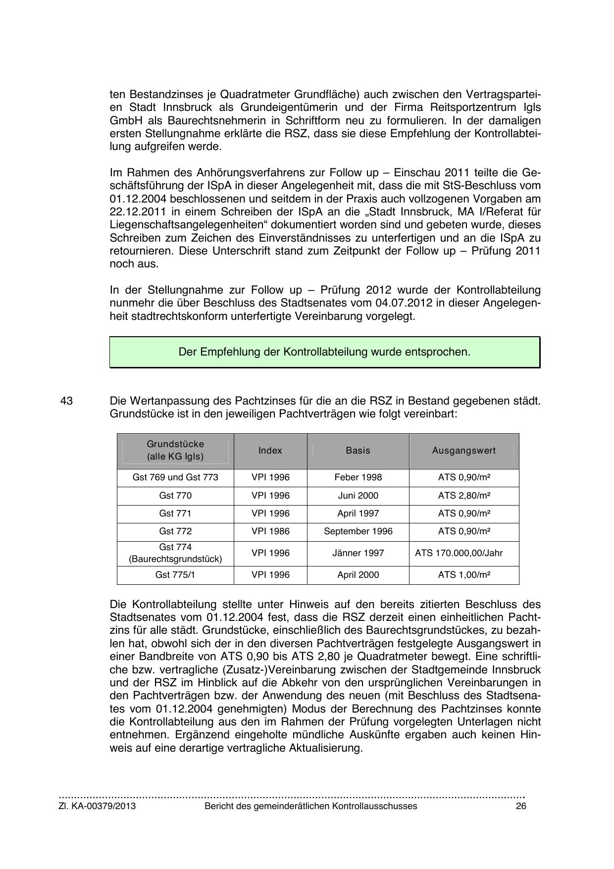 ten Bestandzinses je Quadratmeter Grundfläche) auch zwischen den Vertragsparteien Stadt Innsbruck als Grundeigentümerin und der Firma Reitsportzentrum Igls