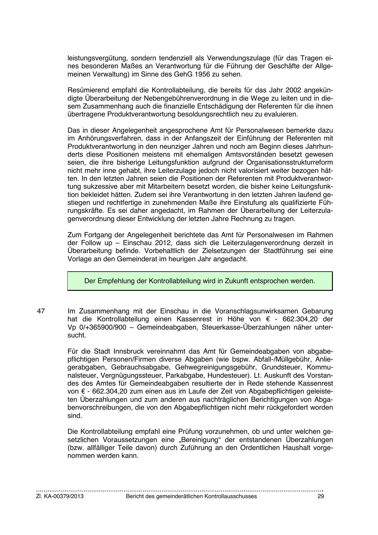 Für die Stadt Innsbruck vereinnahmt das Amt für Gemeindeabgaben von abgabepflichtigen Personen/Firmen diverse Abgaben (wie bspw. Abfall-/Müllgebühr, Anliegerabgaben, Gebrauchsabgabe, Gehwegreinigungsgebühr, Grundsteuer, Kommunalsteuer, Vergnügungssteuer, Parkabgabe, Hundesteuer). Lt. Auskunft des Vorstandes des Amtes für Gemeindeabgaben resultierte der in Rede stehende Kassenrest