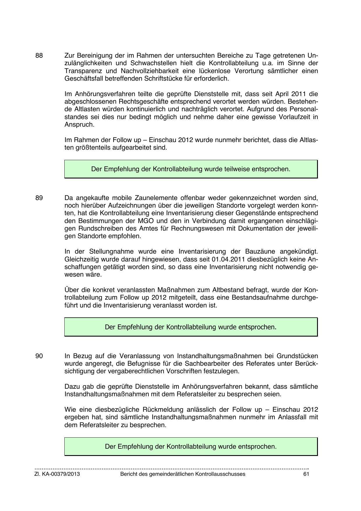 Über die konkret veranlassten Maßnahmen zum Altbestand befragt, wurde der Kontrollabteilung zum Follow up 2012 mitgeteilt, dass eine Bestandsaufnahme durchgeführt und die Inventarisierung veranlasst worden ist.
