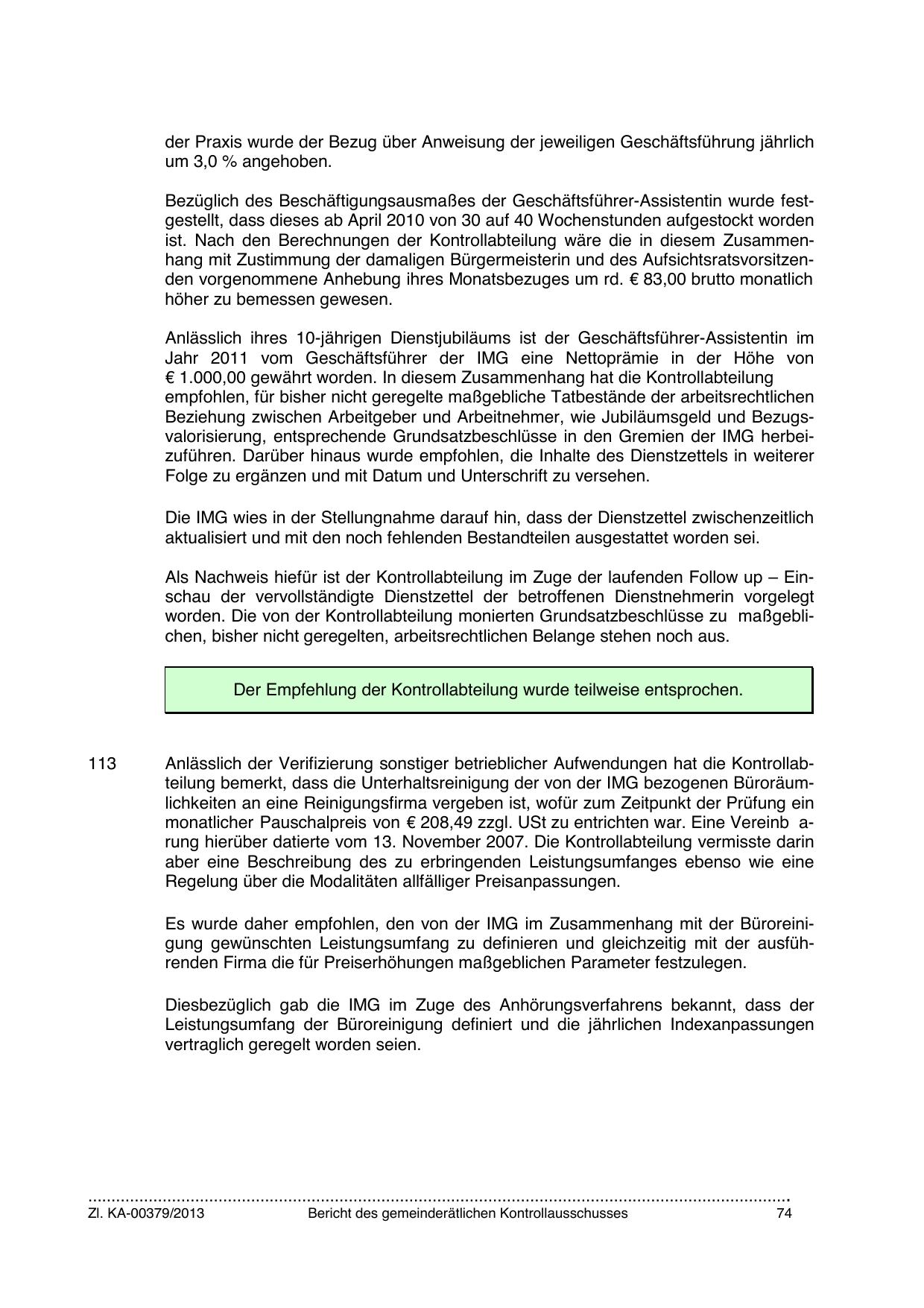 ist. Nach den Berechnungen der Kontrollabteilung wäre die in diesem Zusammenhang mit Zustimmung der damaligen Bürgermeisterin und des Aufsichtsratsvorsitzenden vorgenommene Anhebung ihres Monatsbezuges um rd. € 83,00 brutto monatlich