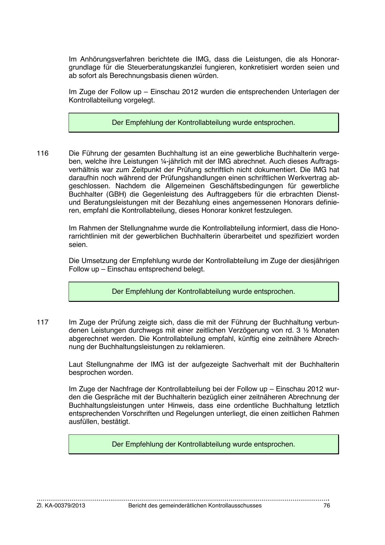 Im Rahmen der Stellungnahme wurde die Kontrollabteilung informiert, dass die Honorarrichtlinien mit der gewerblichen Buchhalterin überarbeitet und spezifiziert worden