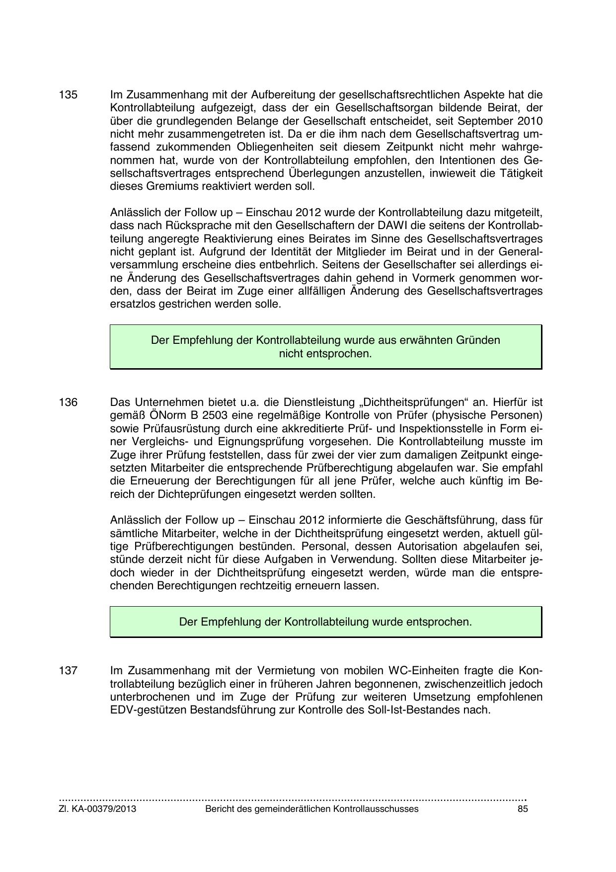 Anlässlich der Follow up – Einschau 2012 wurde der Kontrollabteilung dazu mitgeteilt,